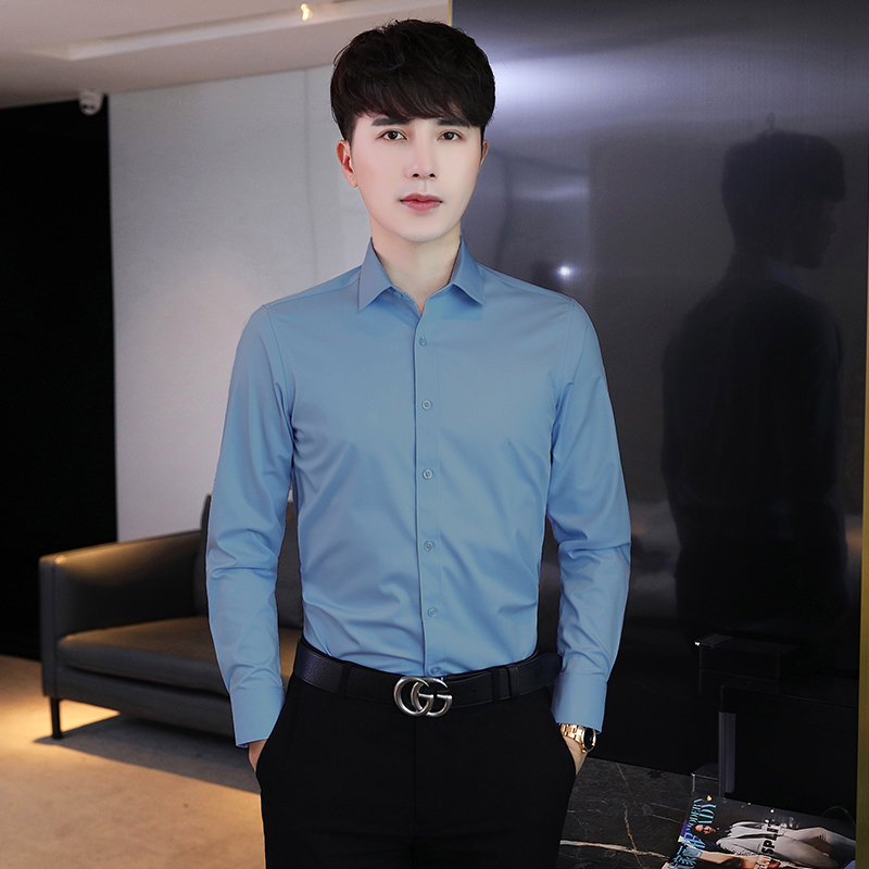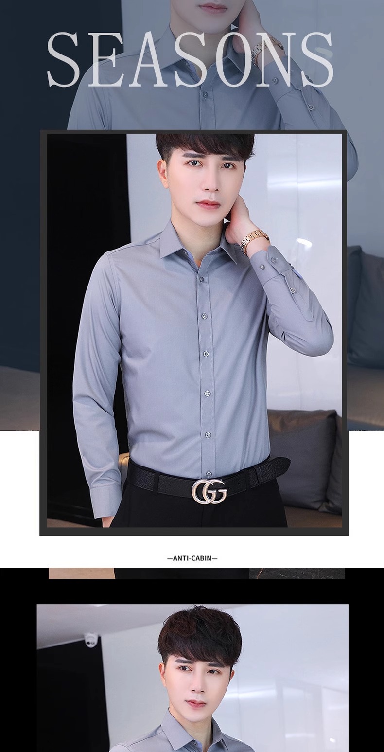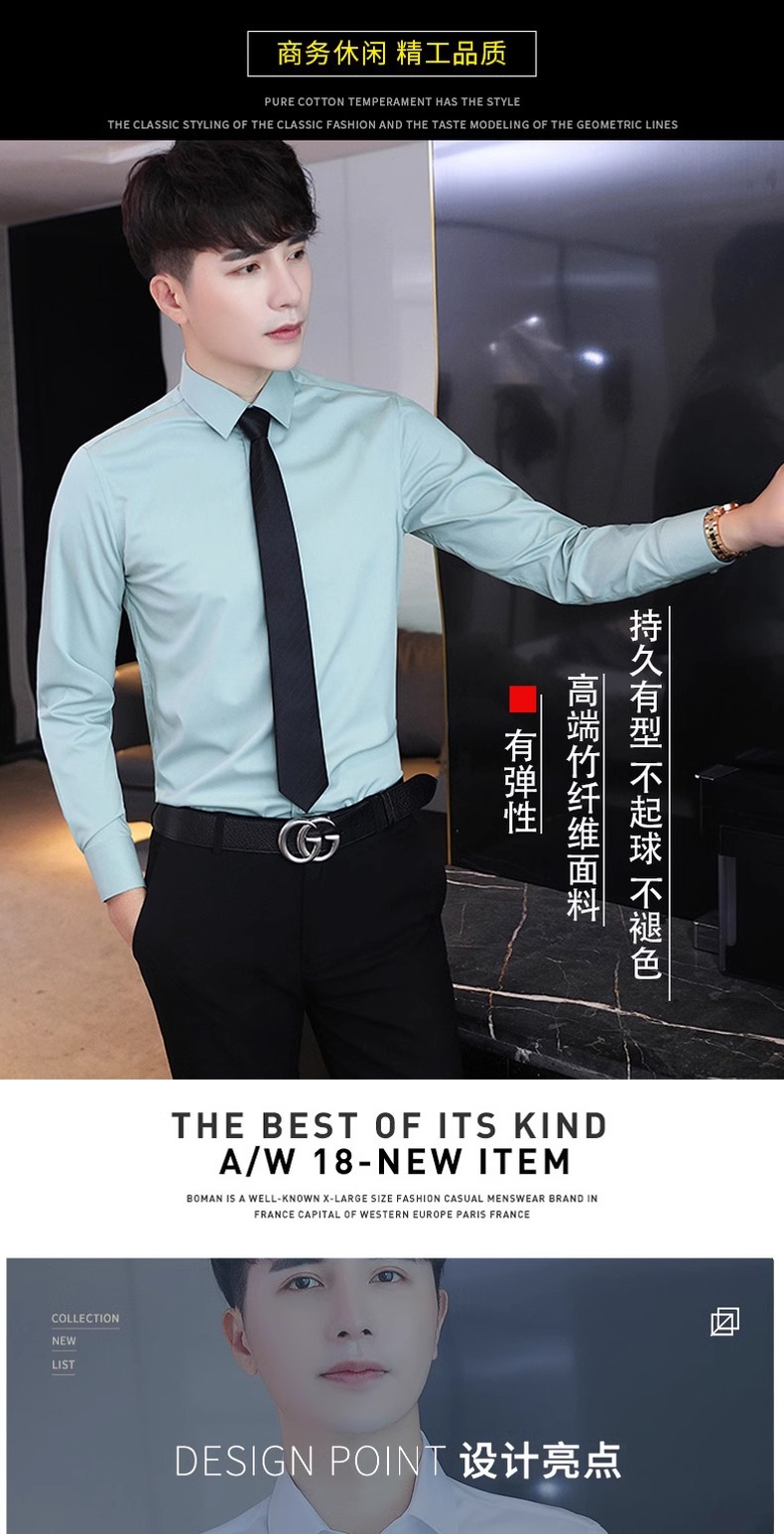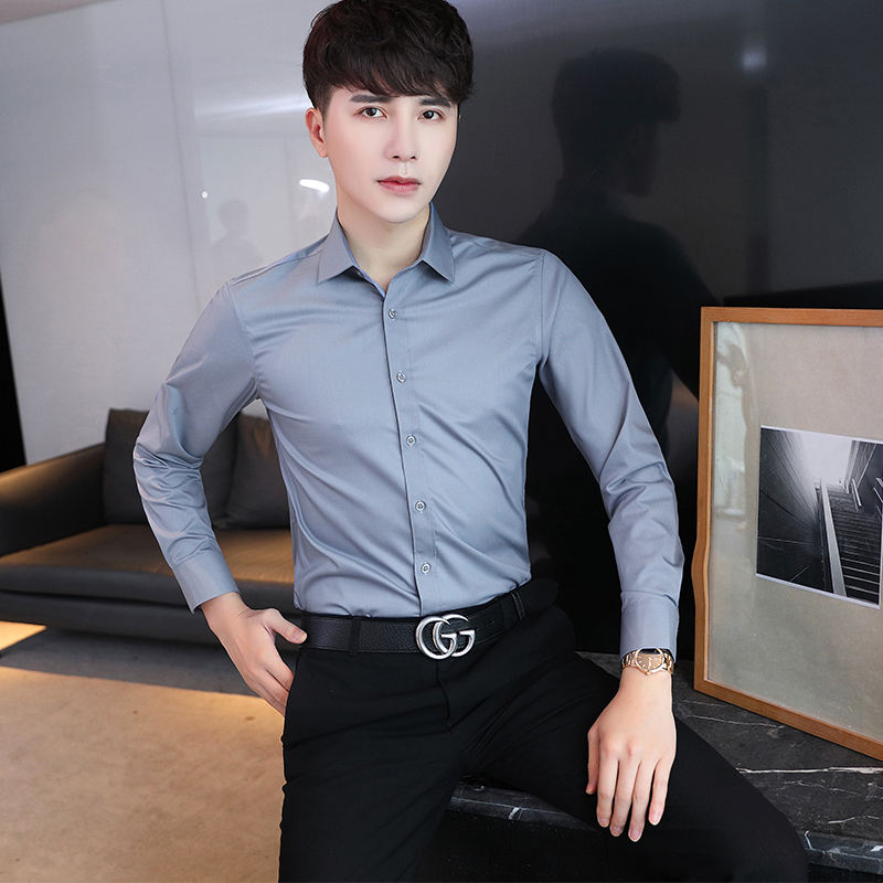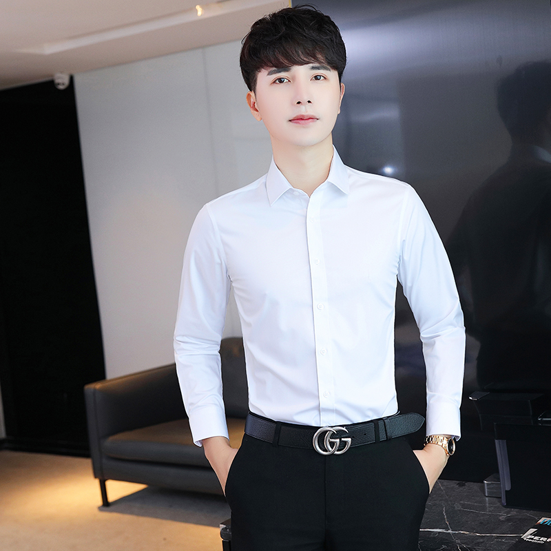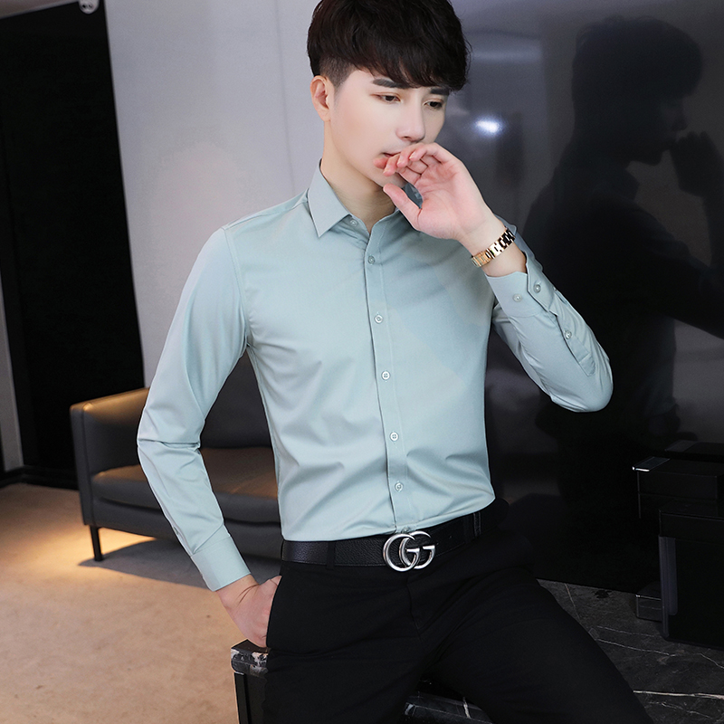 비즈니스 캐주얼 비 다림질 셔츠 남성용 긴팔 봄과 가을 스트레치 슬림 핏 셔츠 한국 유행 잘 생긴 셔츠
