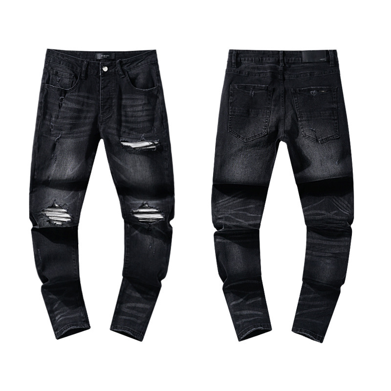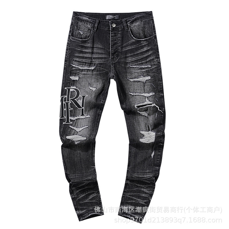 보라색 브랜드 국경 간 스플래시 잉크 인쇄 하이 스트리트 레트로 찢어진 캐주얼 트렌디 데님 바지