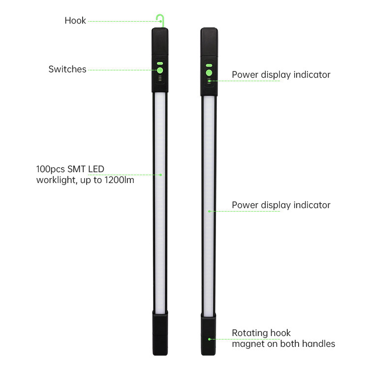 .LED工作灯,高1200lm,中600lm,低300lmm。(单根白光高光600lm, 中光300lm, 低光150lm)。