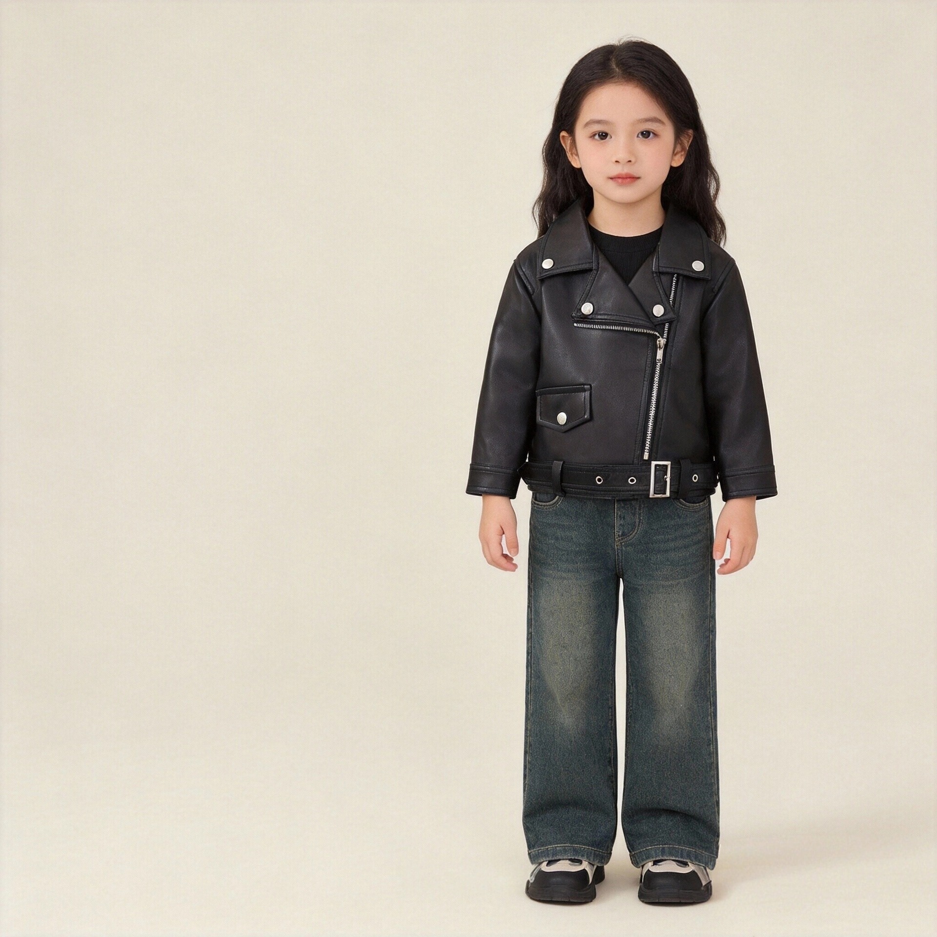 여자 긴팔 대형 옷깃 가죽 자켓 2025 가을 새로운 한국 스타일 멋진 여자 오토바이 자켓 중소 어린이를위한