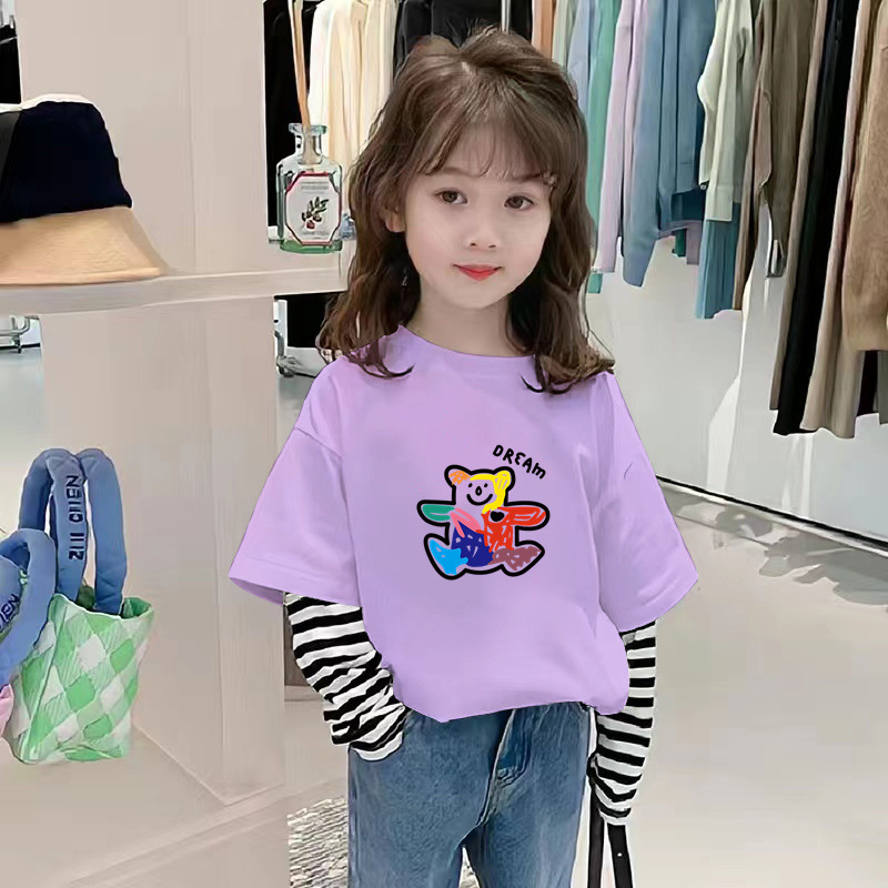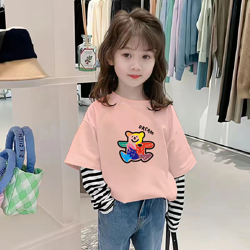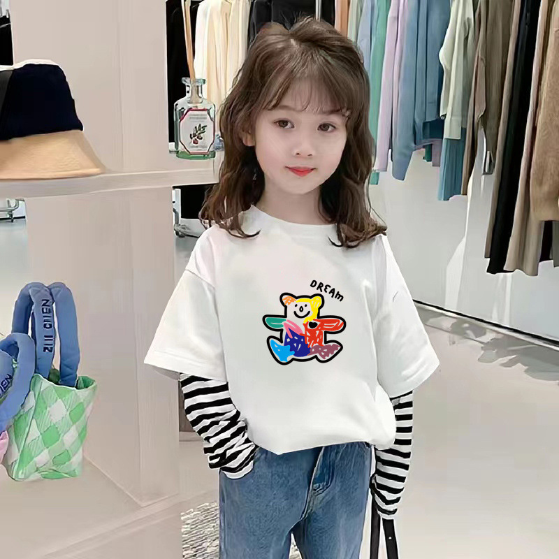 G2113 # 아동용 코튼 긴팔 티셔츠 소녀 새 줄무늬 바닥 셔츠 소년 소녀 가짜 투피스 인쇄