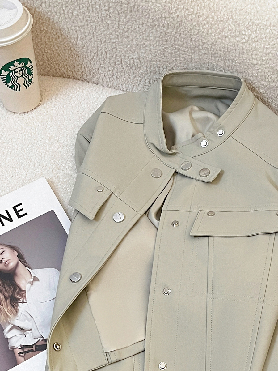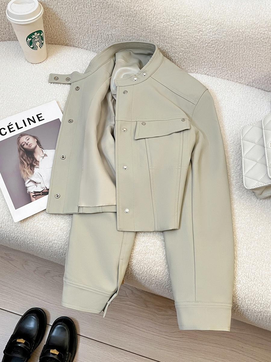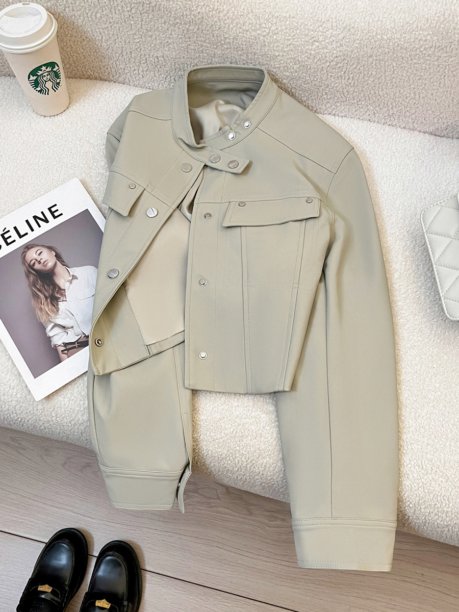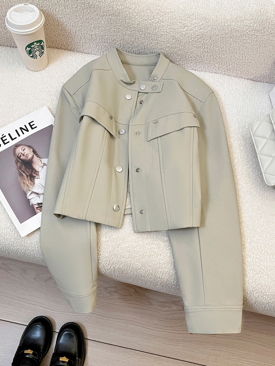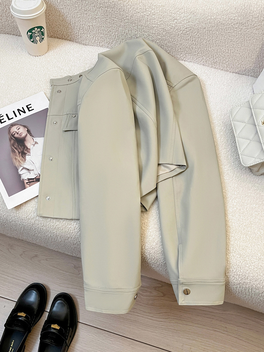 라이스 그레이 슈퍼 잘 생긴 가죽 자켓 여성의 2024 가을 새로운 우아한 유행 짧은 느슨한 오토바이 가죽 자켓