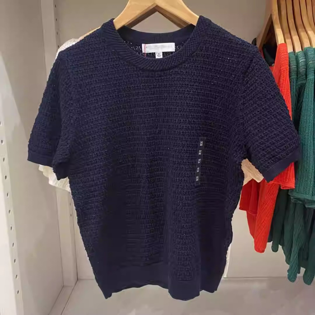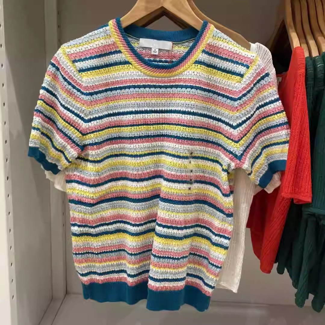 일본 싱글 24 여름 새로운 여성 프랑스 컬러 스트라이프 크루 넥 스웨터 짧은 소매 468626 467061