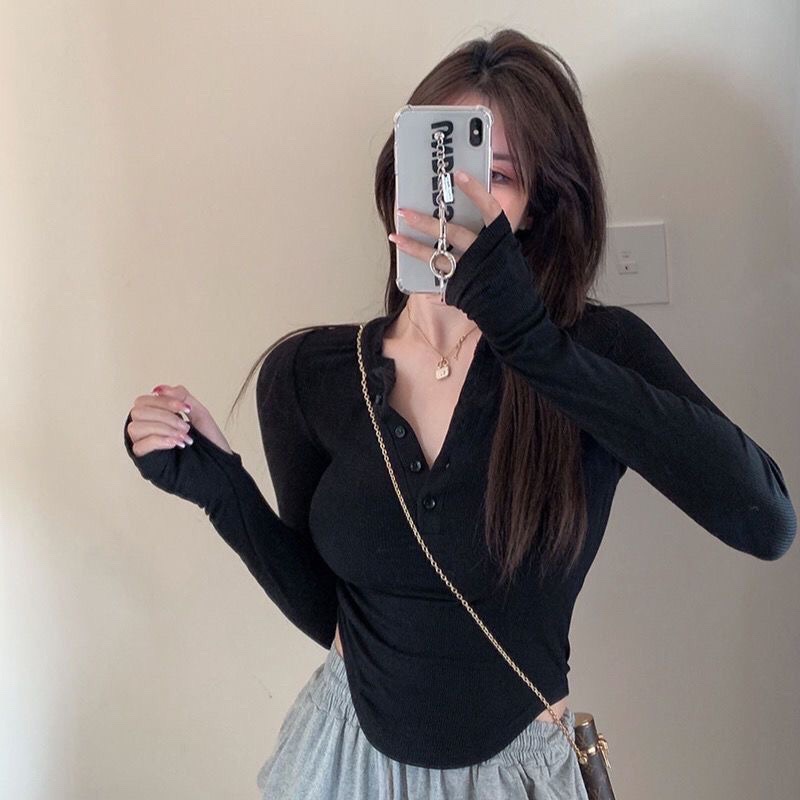 봄과 가을 새로운 불규칙한 긴팔 티셔츠 여성용 섹시한 V 넥 순수한 욕망 스타일 탑 디자인 틈새 세련된 기본 셔츠