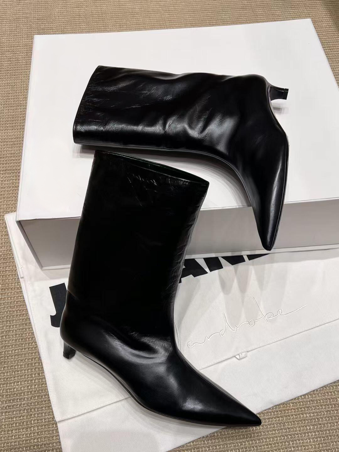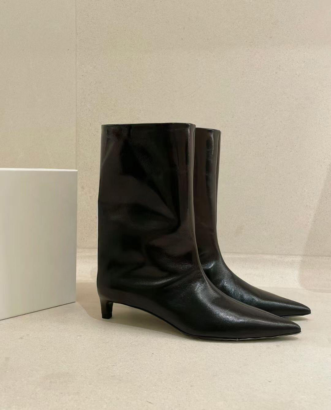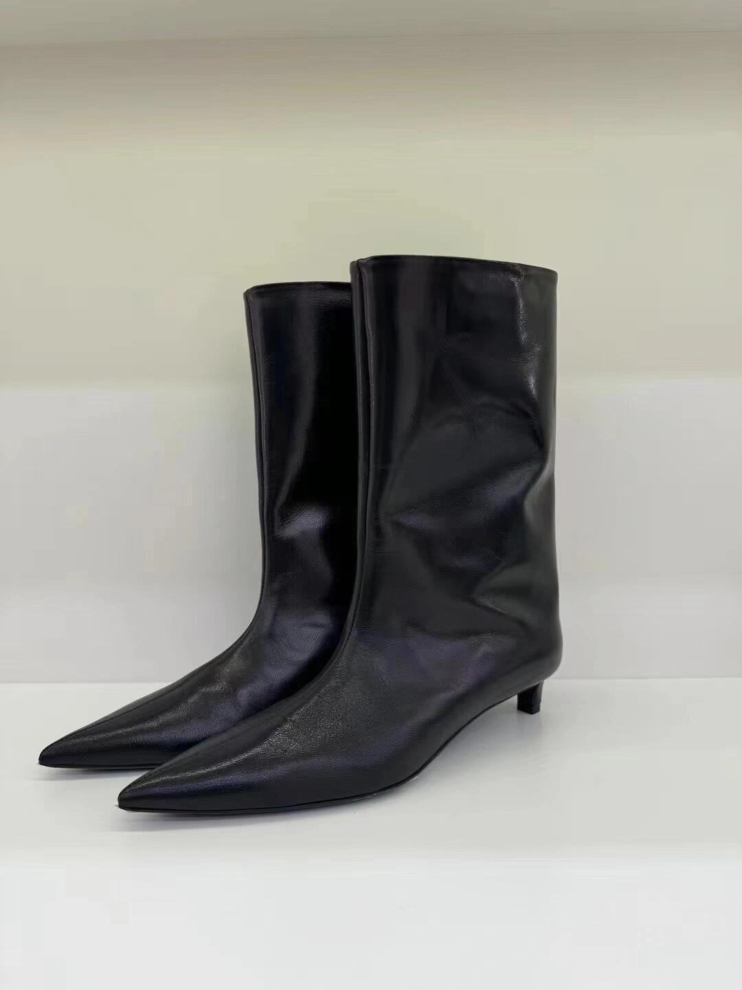 신헝잔~세련된 부드러운 가죽 뾰족코 하이힐 미들 부츠 여성용 프렌치 스타일 와이드 부츠 앵클 부츠 나이트 부츠 마틴 부츠