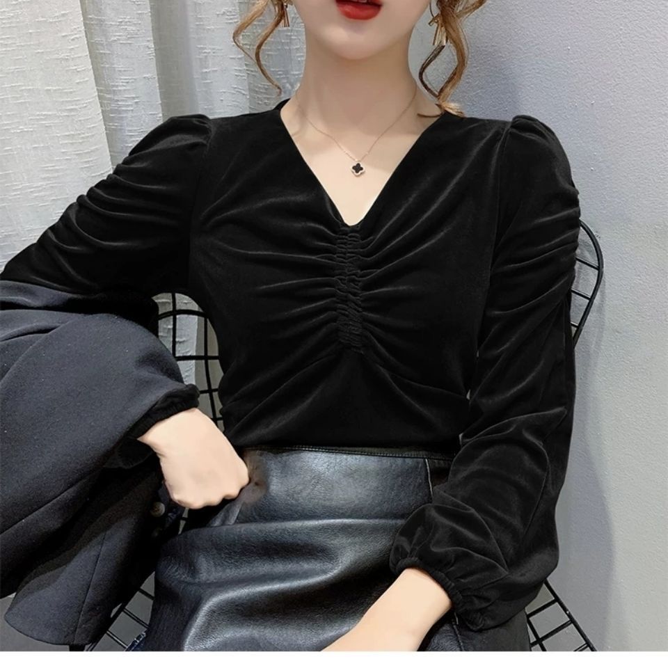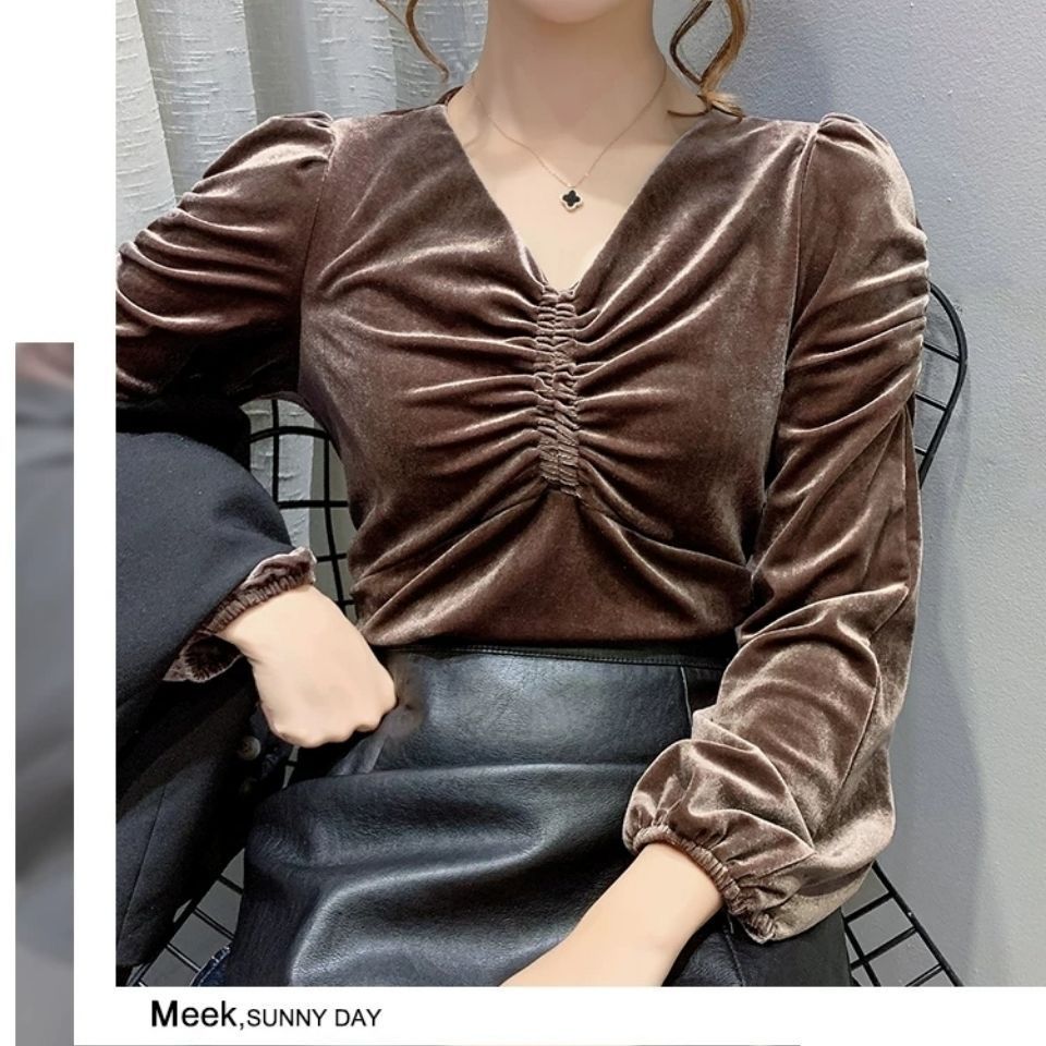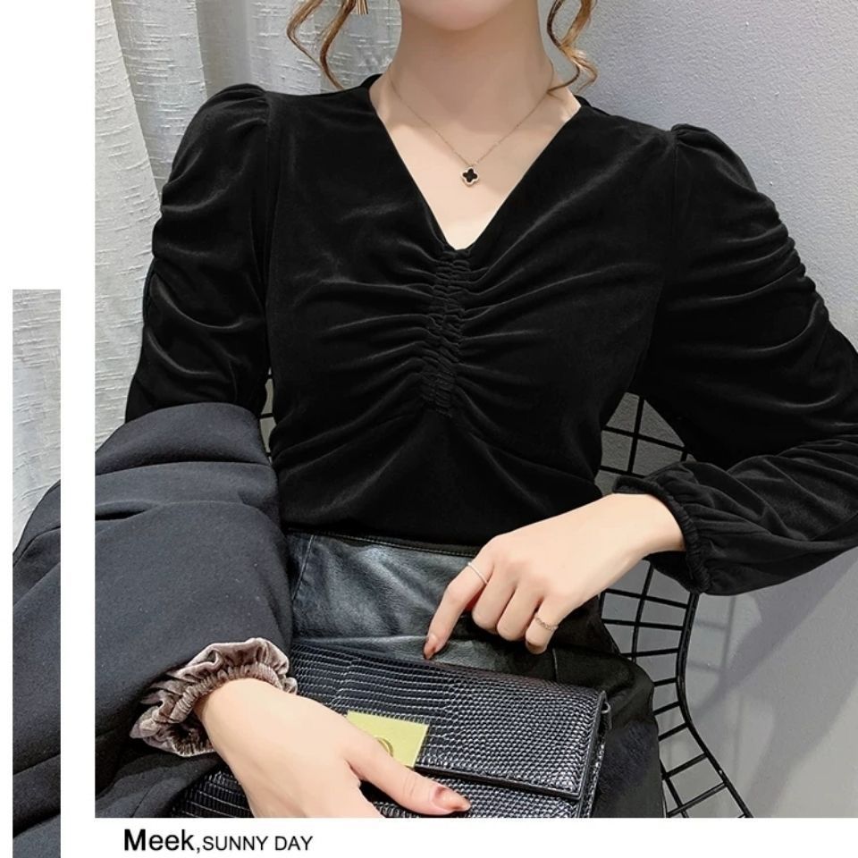 가을과 겨울 골든 벨벳 탑 봄과 가을 버블 2024 새로운 올 매치 루즈 스타일스터 긴팔 티셔츠스토어 가기