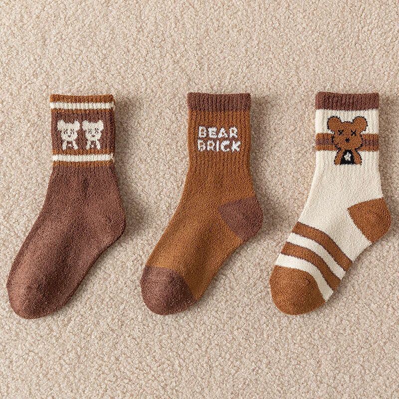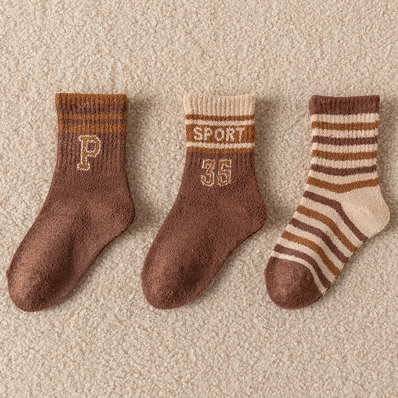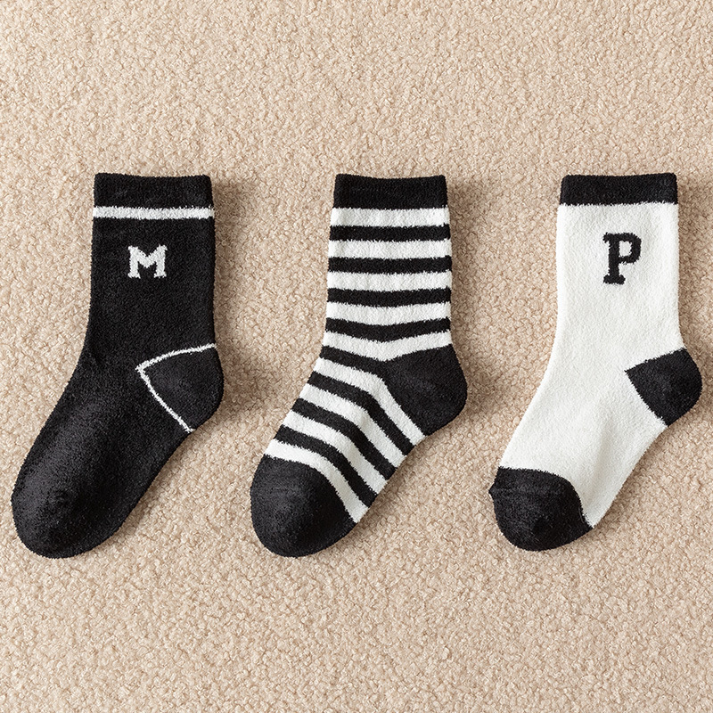 어린이 양말 겨울 기모 두꺼운 튜브 양말 소년 아기 흑백 줄무늬 문자 MP 산호 양털 수면 양말