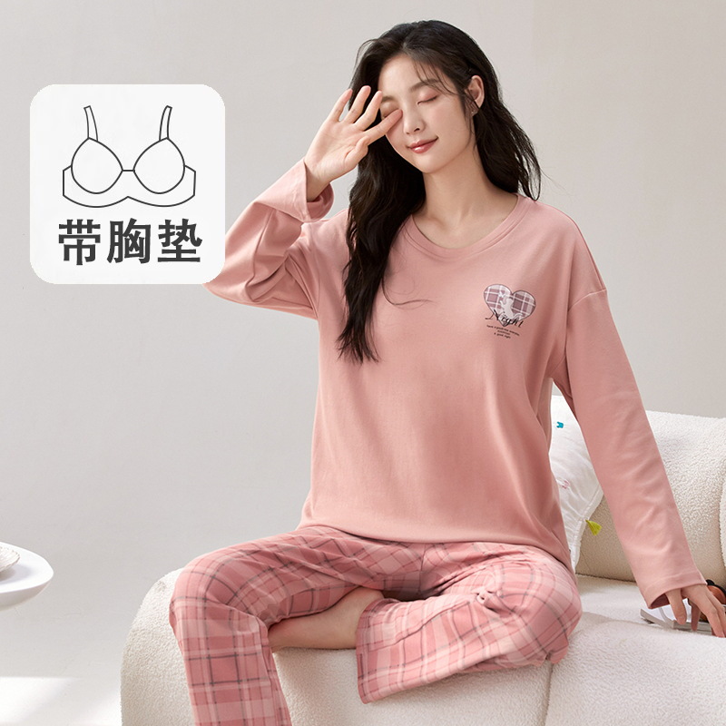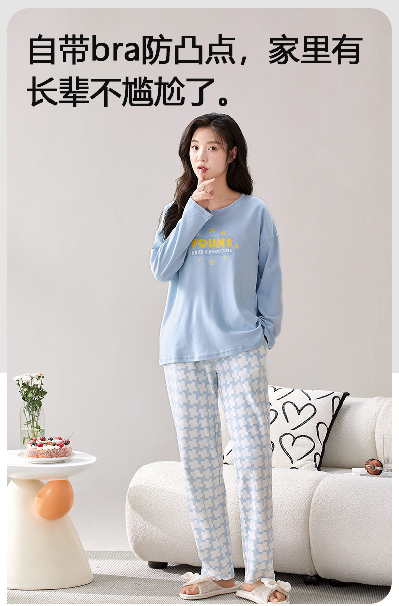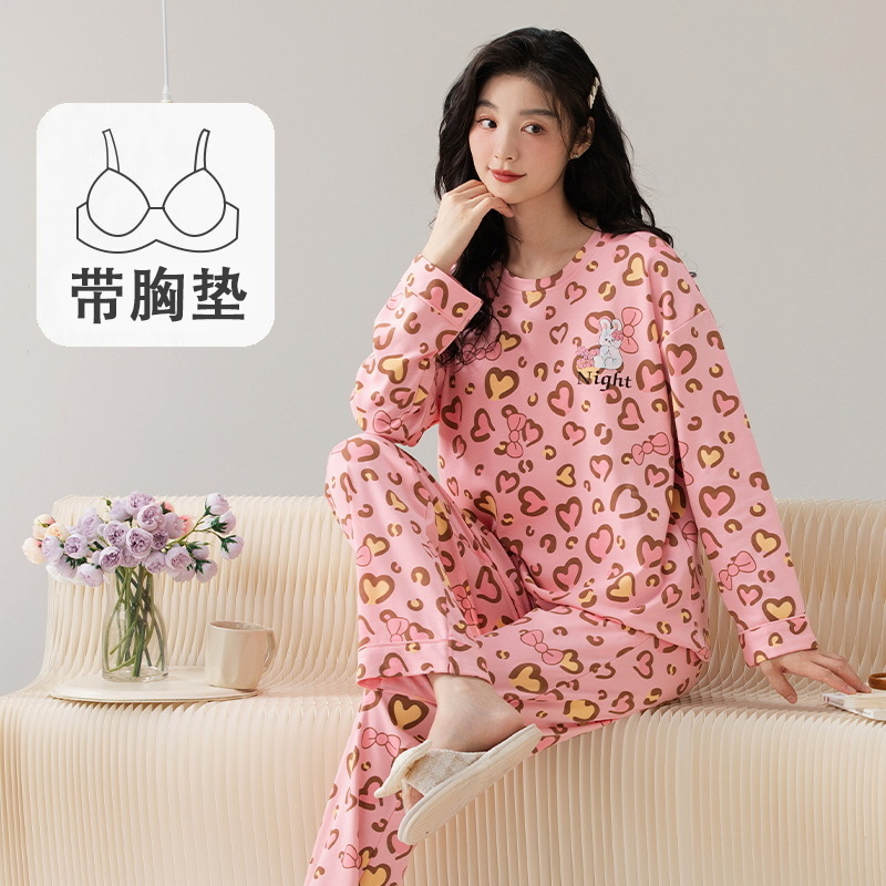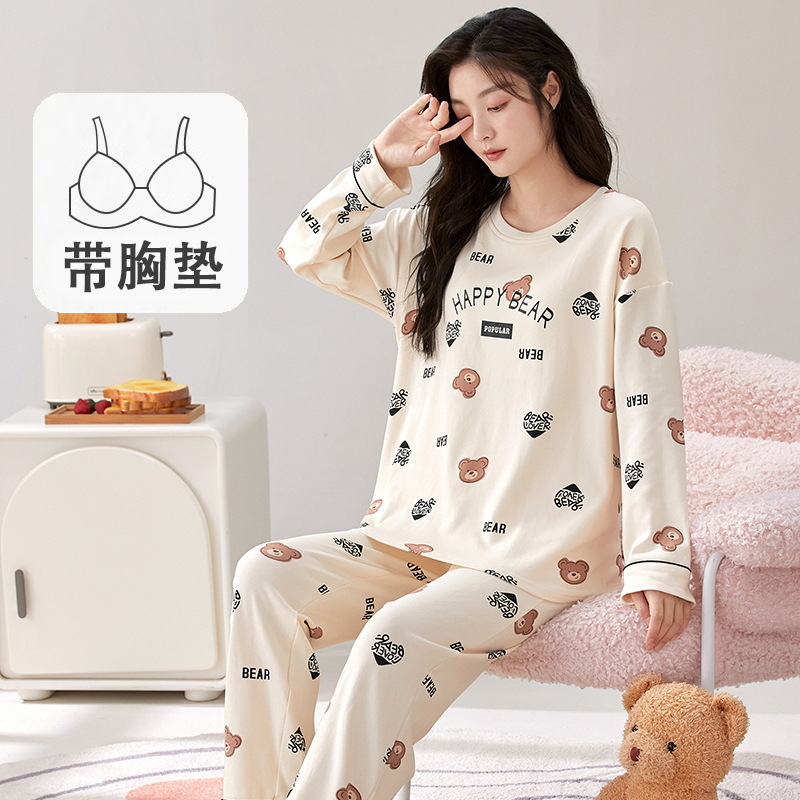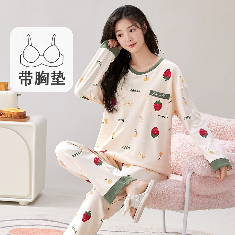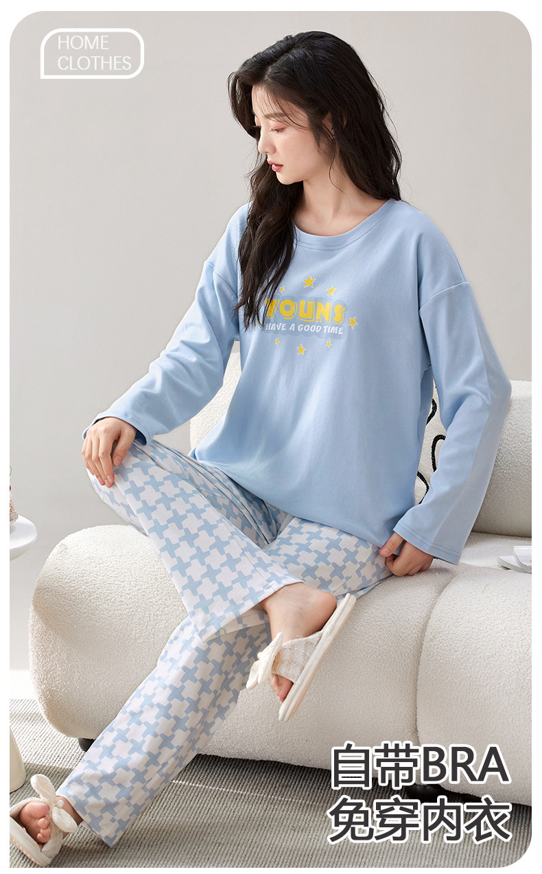 크루 넥 풀오버 파자마 여성의 봄과 가을, 가슴 패드웨어-무료 속옷 긴팔 홈 옷 안티 범프 복장