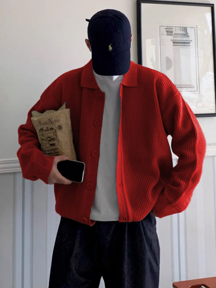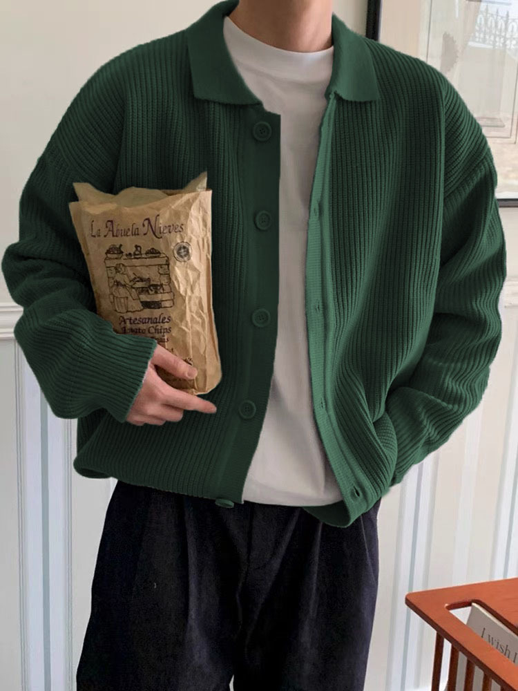 단색 옷깃 니트 스웨터 카디건 재킷 남자 가을 스웨터 한국 유행 캐주얼 게으른 스타일 탑 옷깃