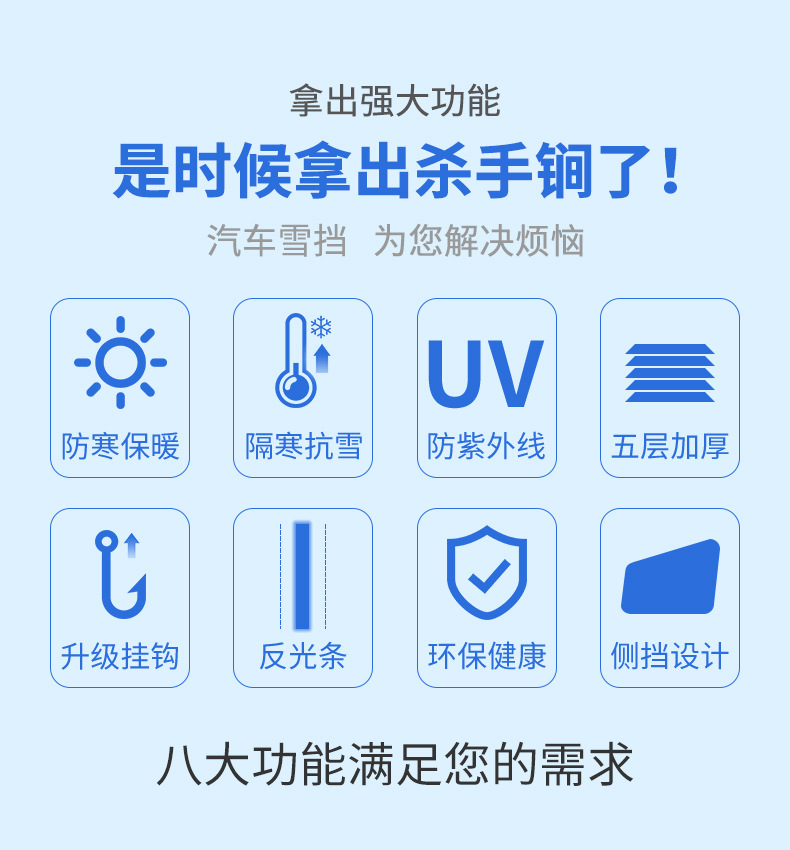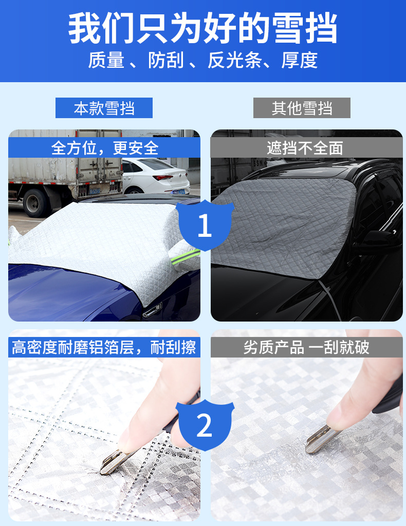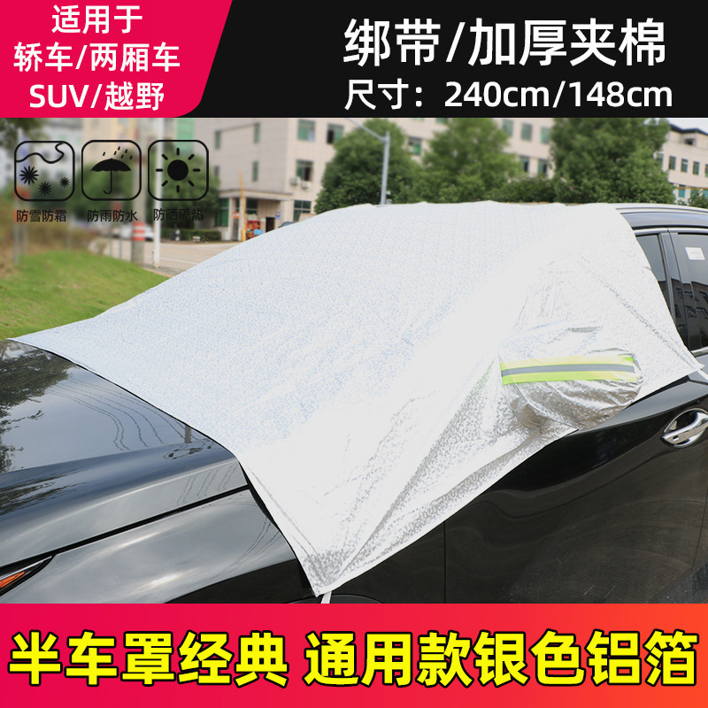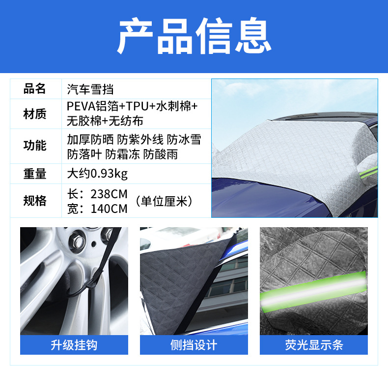 【产品特点】:1、铝膜材质,不伤车漆,防晒、隔热、防雨雪、防风尘、防划痕、防紫             外线、抗拉力强。