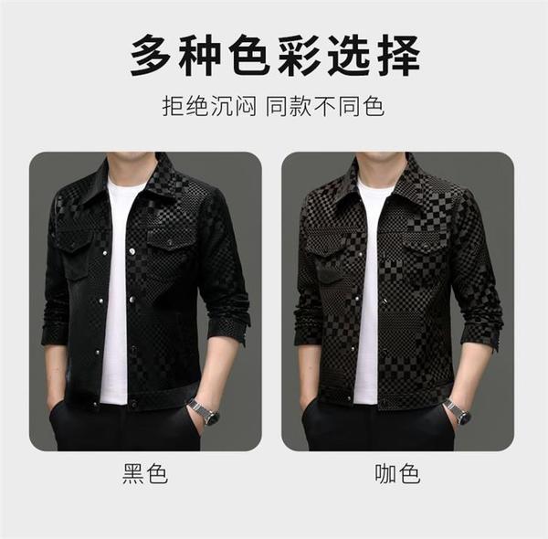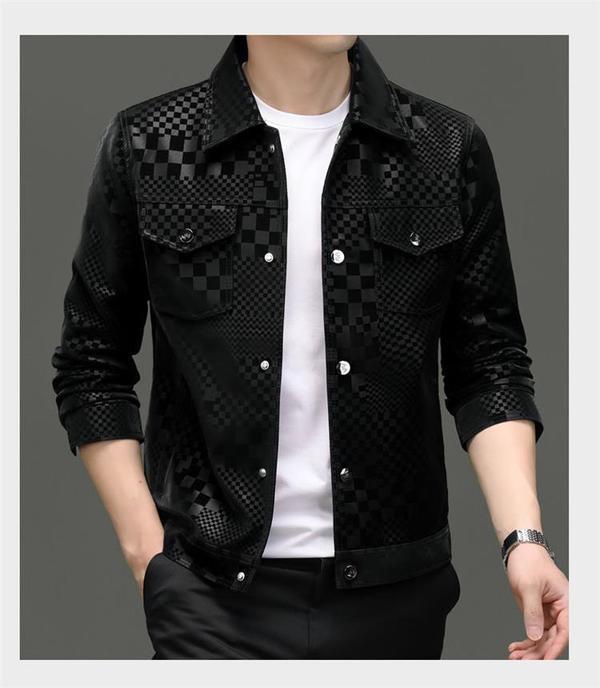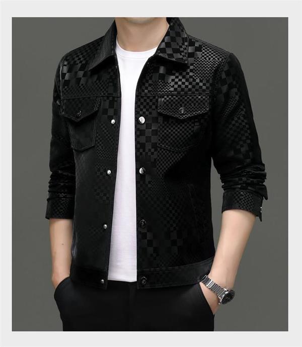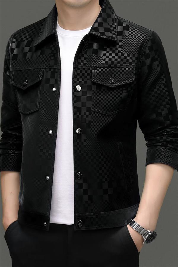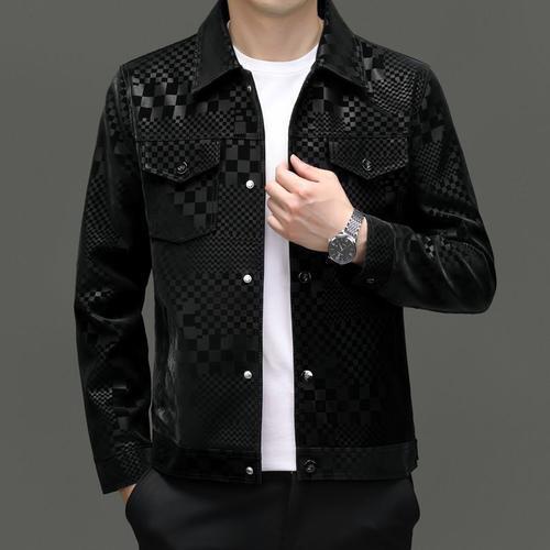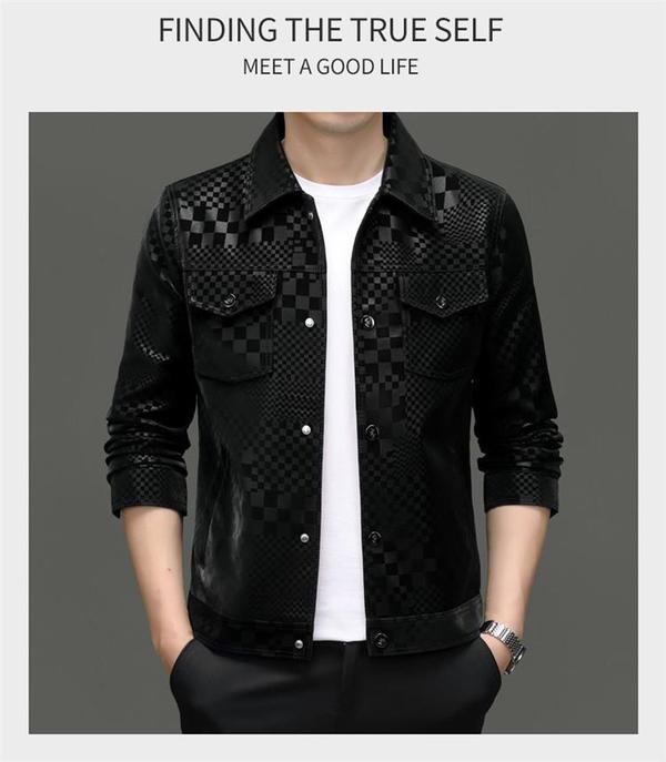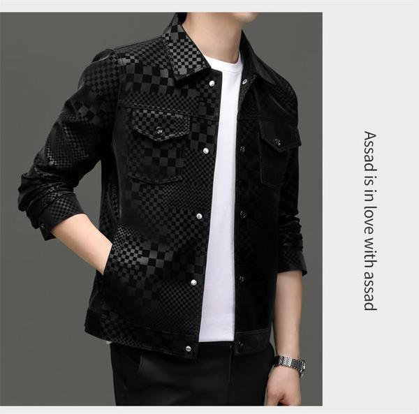 2024 가을과 겨울 Haining 정말 좋은 가죽 짧은 옷깃 남성 재킷 청소년 슬림 핏 얇은 체크 무늬 가죽 재킷