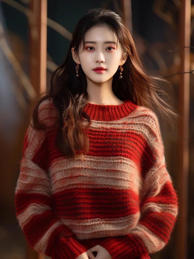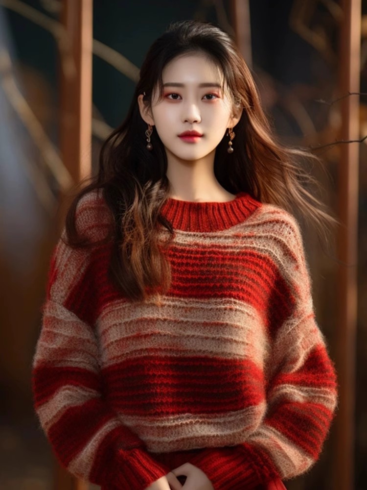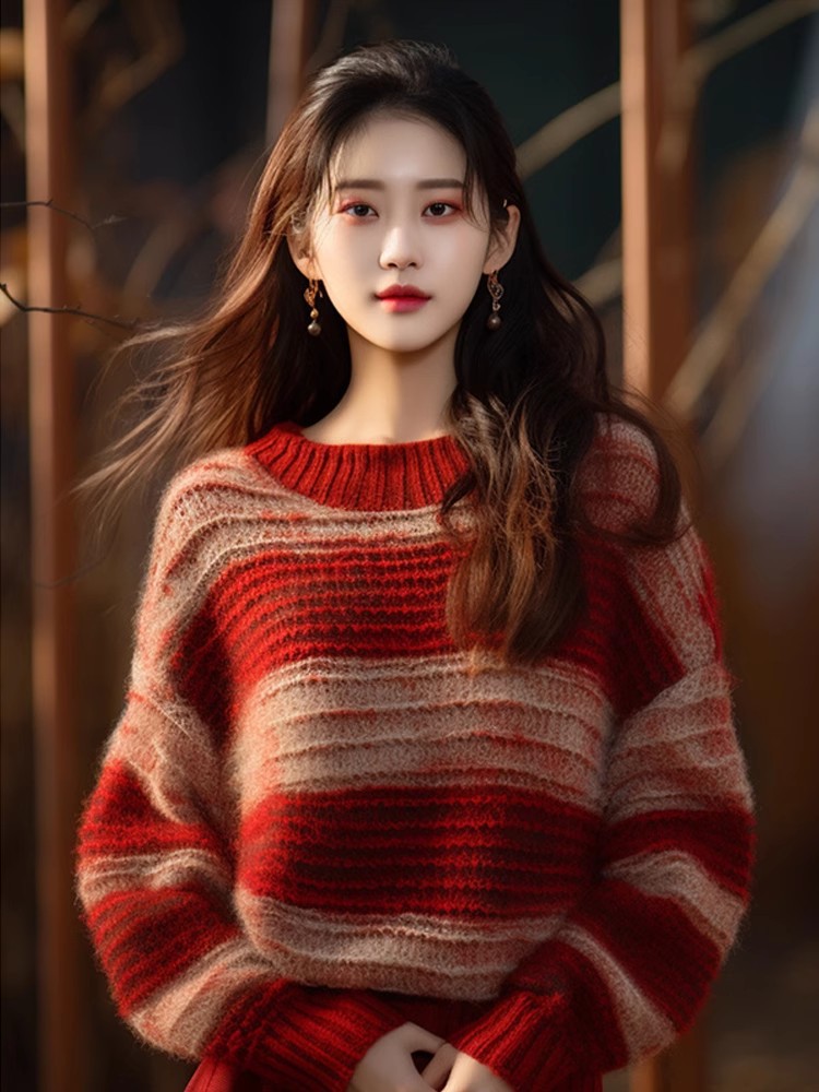 크리스마스 설날 붉은 색 줄무늬 스웨터 여성의 가을과 겨울 2024 새로운 스타일 샤넬 스타일 느슨한 두꺼운 니트 탑스토어 가기
