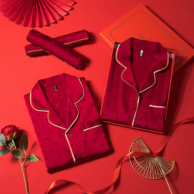 [붉은 사랑] 커플 잠옷 여성 봄 · 가을 결혼식 새틴 신혼의 붉은 생애 자카드 집 옷 남성스토어 가기