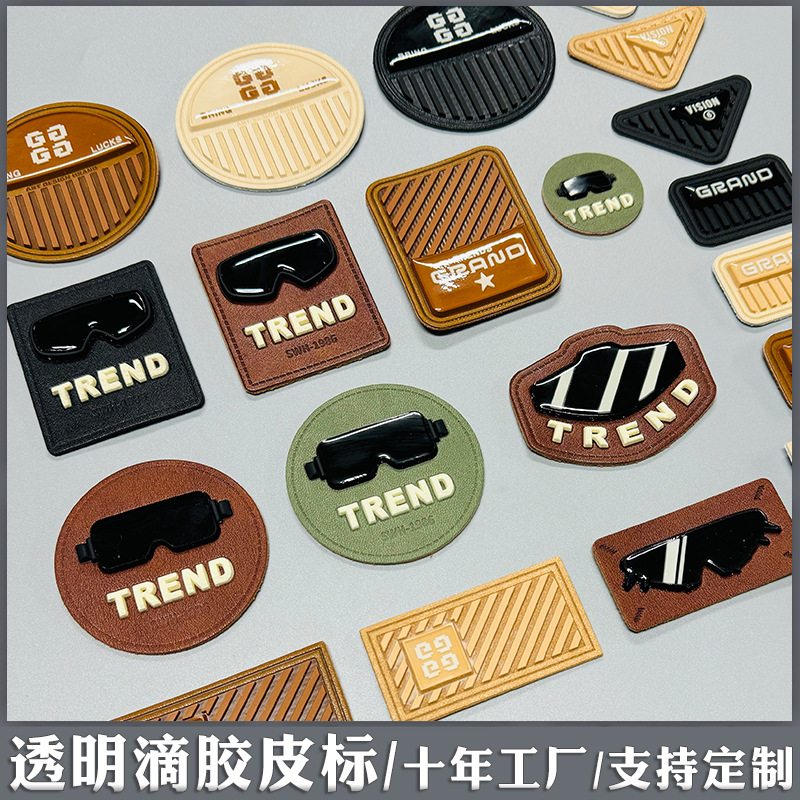 3 차원 가죽 라벨 10 년 공장 투명 드롭 플라스틱 가죽 브랜드 안경 장식 라벨 의류 가방 고무 압축 성형 가죽 스탬프