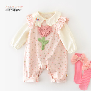 女童婴幼儿春装新款碎花裤子 新生儿宝宝外出飞袖连体背带裤51023