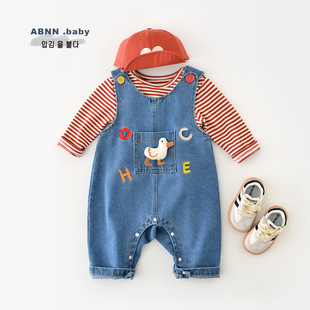 阿宝囡囡春秋新款儿童卡通裤子 宝宝新生儿小鸭子牛仔背带裤51618