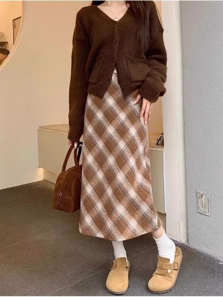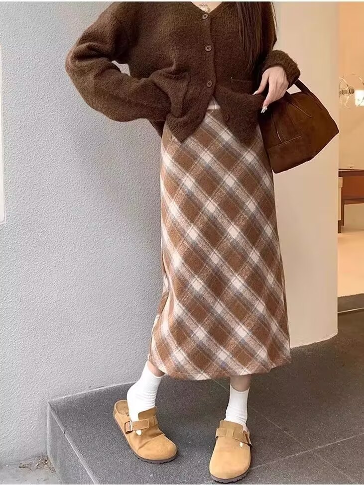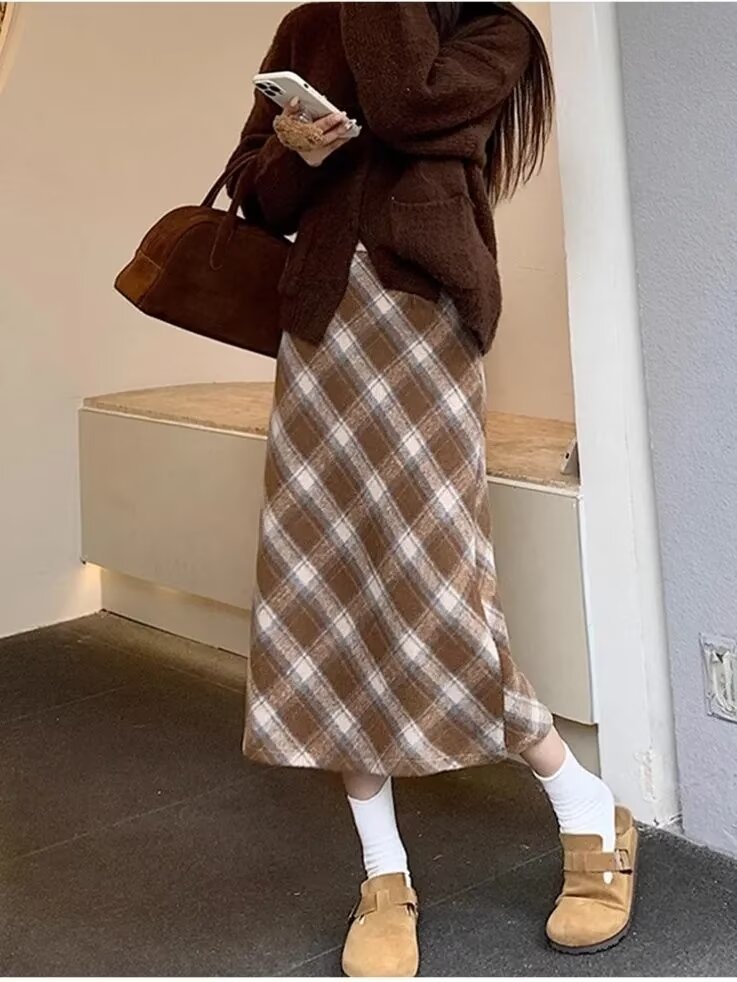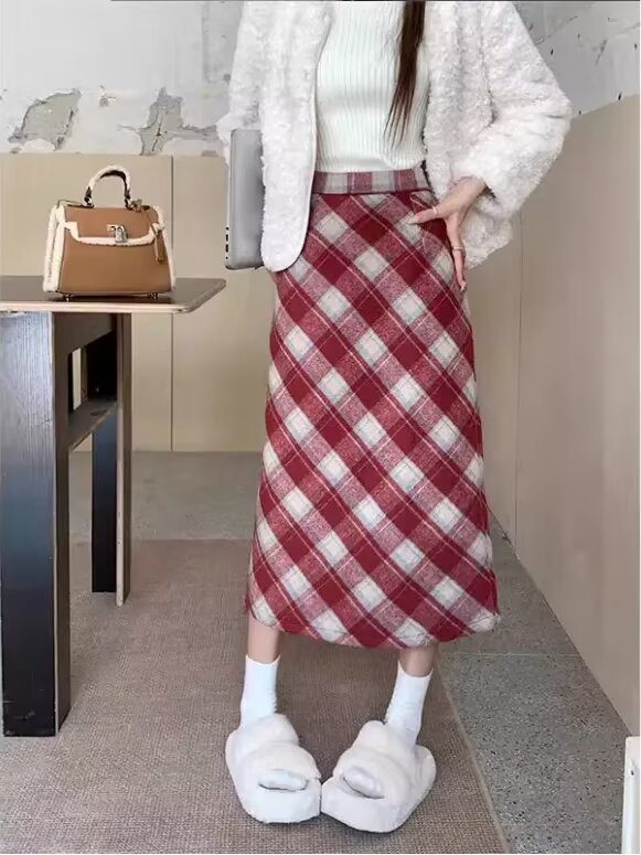 여성용 레트로 체크 무늬 모직 스커트, 아메리칸 하이웨이스트 중간 길이 A라인 힙 스커트, 가을 겨울 슬리밍 하이웨이스트 스커트 인스토어 가기