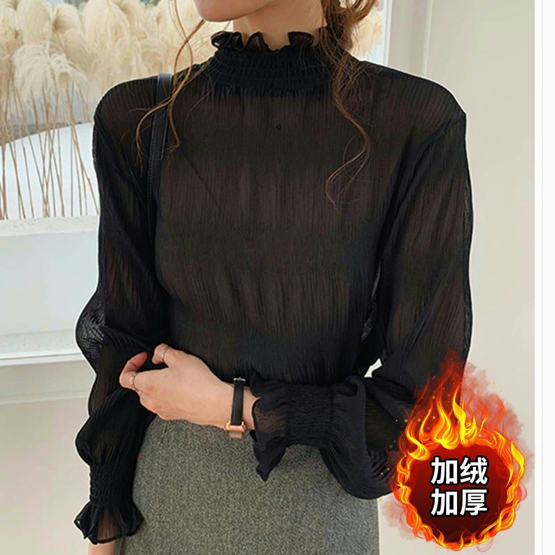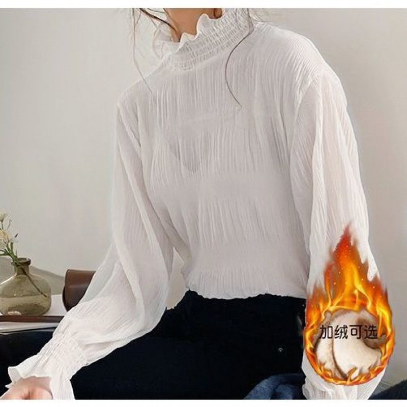 수직 칼라 살구색 레이스베이스 셔츠 여성의 봄과 가을 2024 년 새 기모 쉬폰 셔츠 귀 테두리 원사 탑