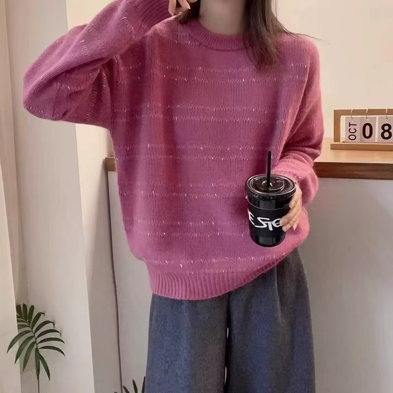2024 가을과 겨울 새로운 화이트 로즈 핑크 스웨터 밝은 라인 스트라이프 디자인 캐주얼 라운드 넥 소프트 왁스 같은 여성용 풀오버 탑스토어 가기