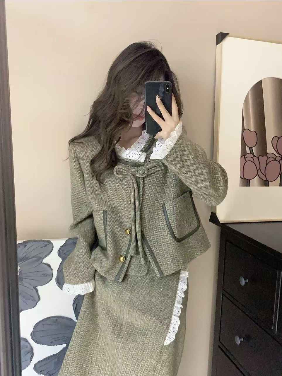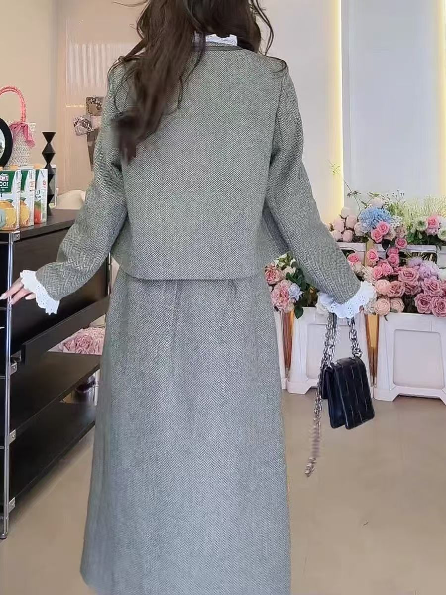 샤넬 스타일 세트 여성의 가을과 겨울 모직 레이스 짧은 코트 높은 허리 스커트 고급 소형 원피스 투피스 세트