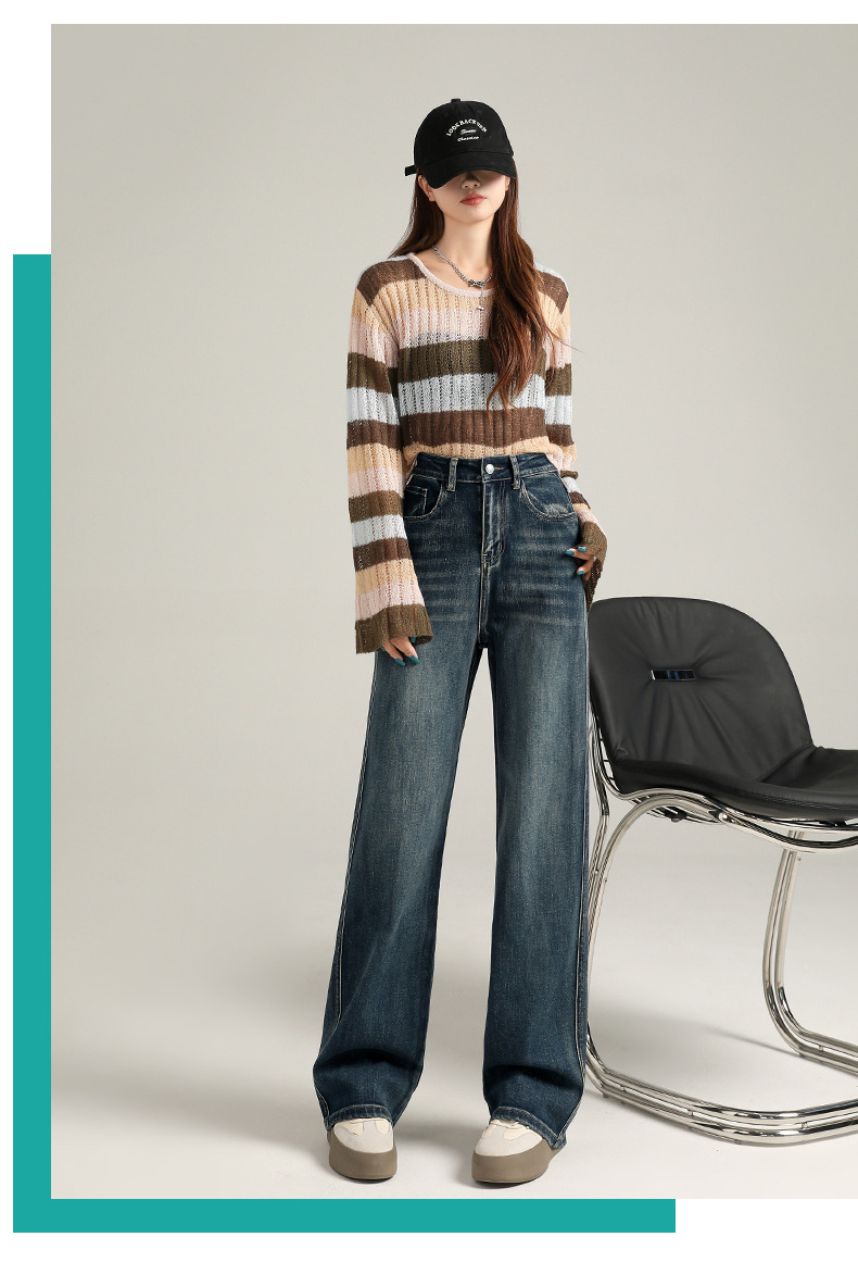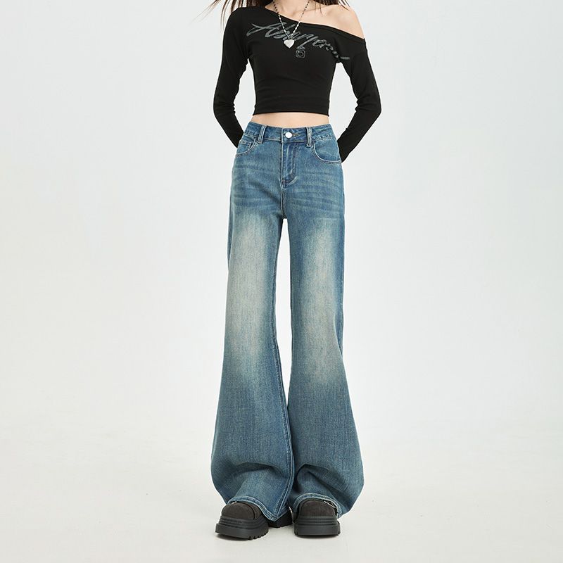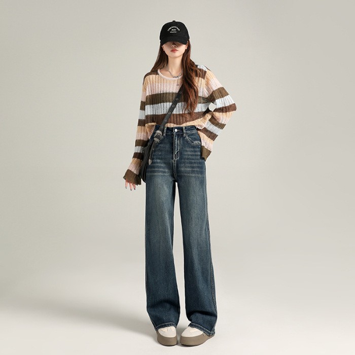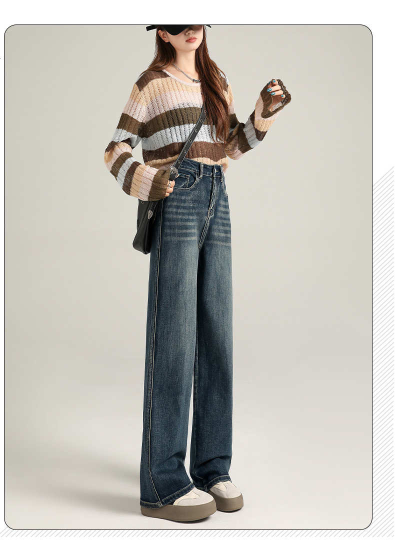 超柔弹力直筒裤女秋宽松窄版阔腿牛仔裤女高腰加绒牛仔裤子女秋冬