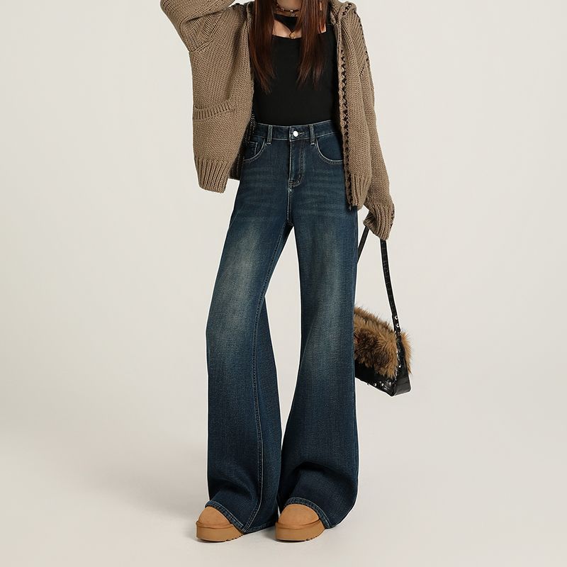 초부드러운 신축성 있는 스트레이트 팬츠 여성용 가을 슬림핏 와이드 레그 청바지 여성용 가을 하이웨이스트 플리스 안감 청바지 여성용 가을 겨울