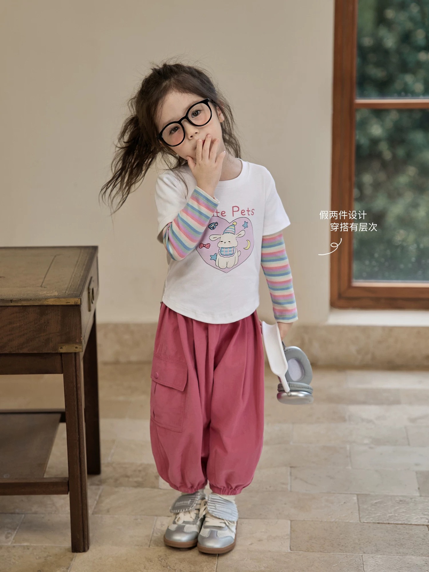 여아 티셔츠 2025 봄 가을 한국 스타일 페이크 투피스 스웨트셔츠 A급 아동 이너웨어 가을 긴팔 상의 아동복