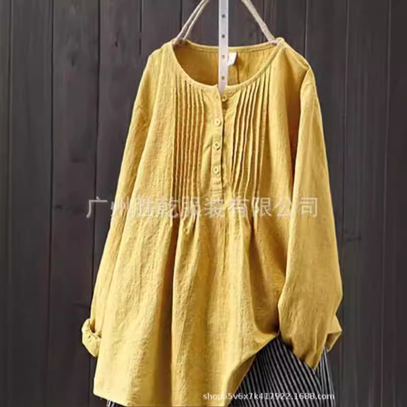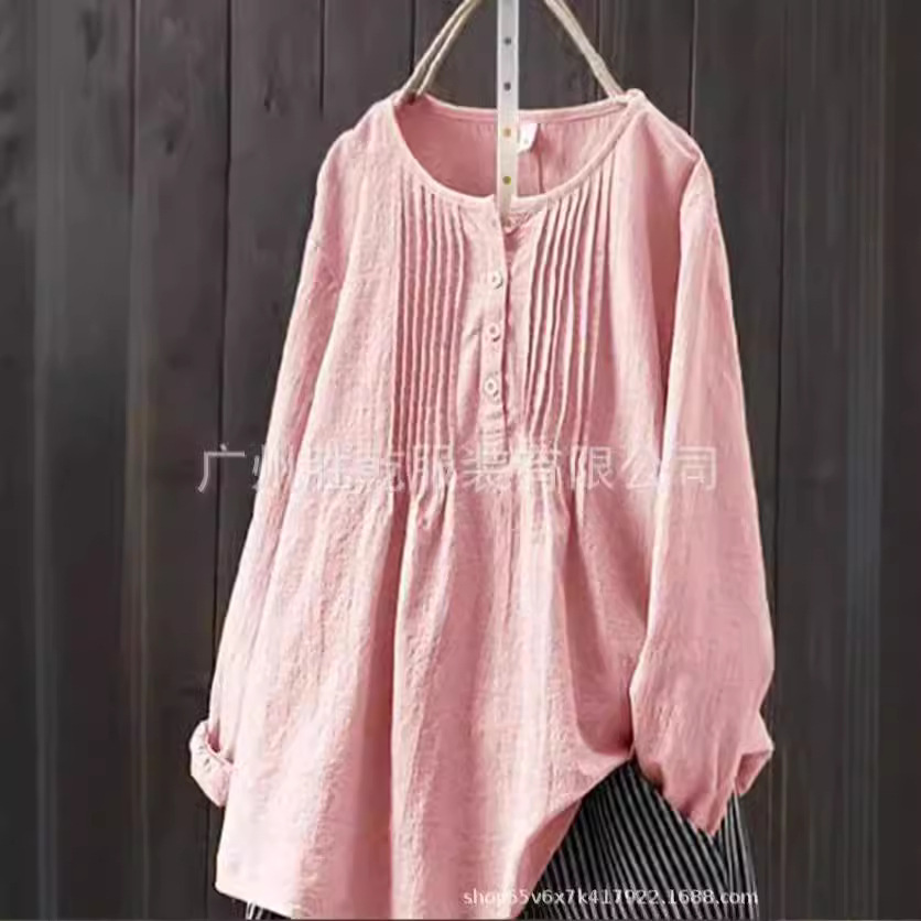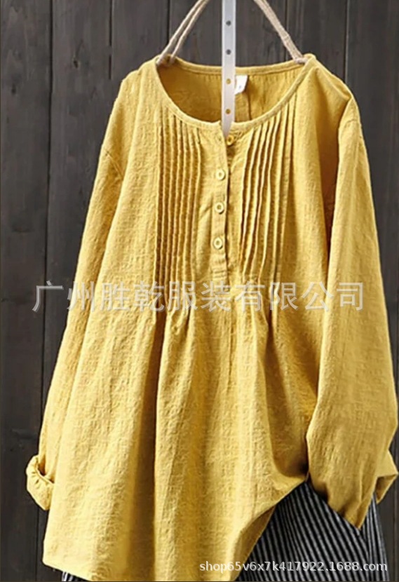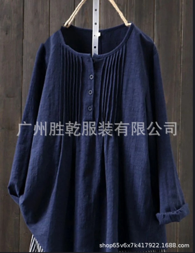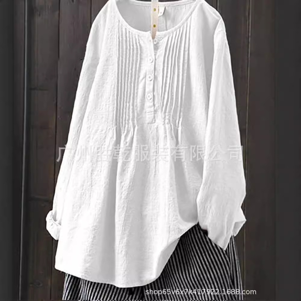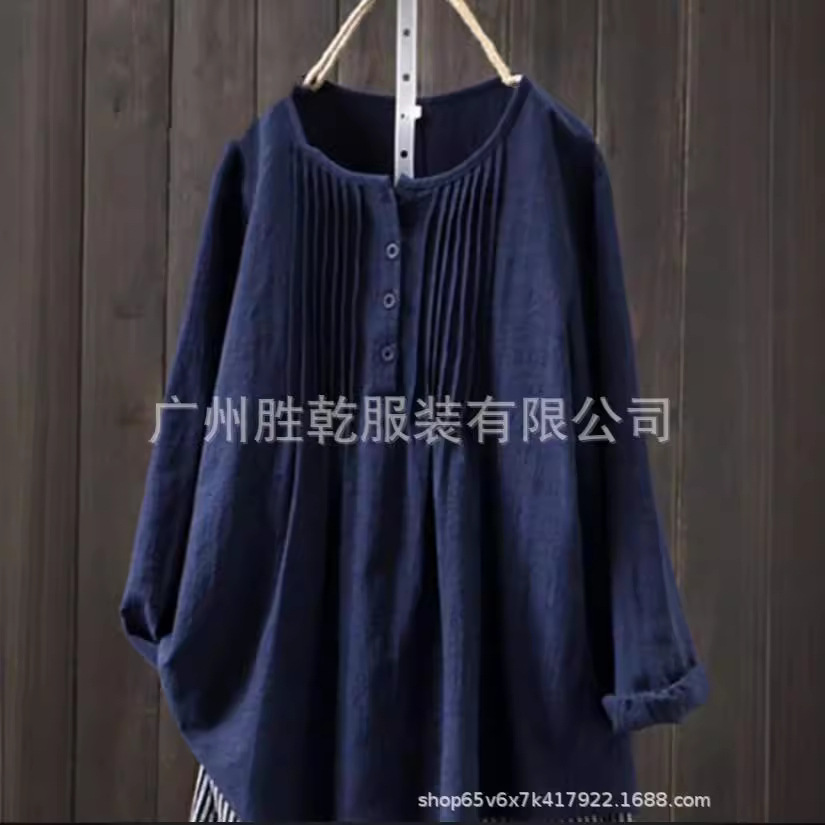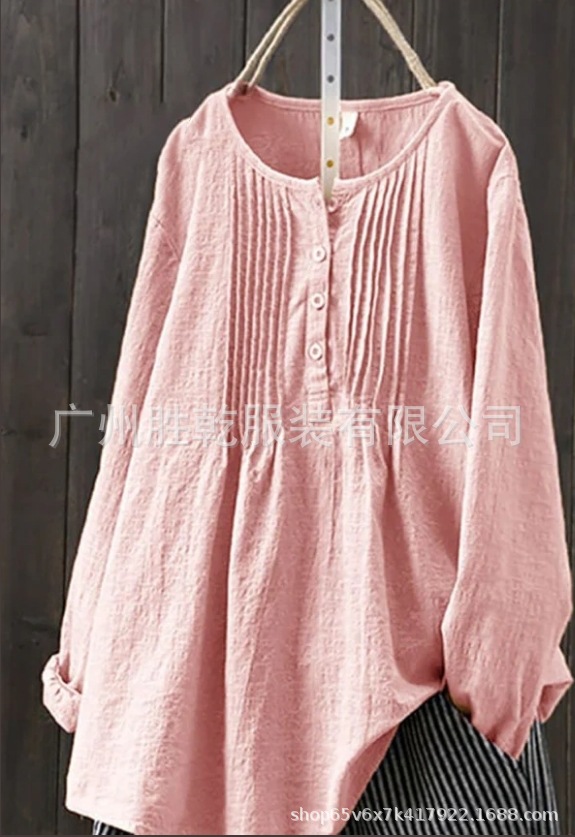 2024 새로운 국경 간 전자 상거래 아마존 느슨한면과 린넨 긴 소매 여성용 주름 라운드 넥 여성용 플러스 사이즈 셔츠스토어 가기
