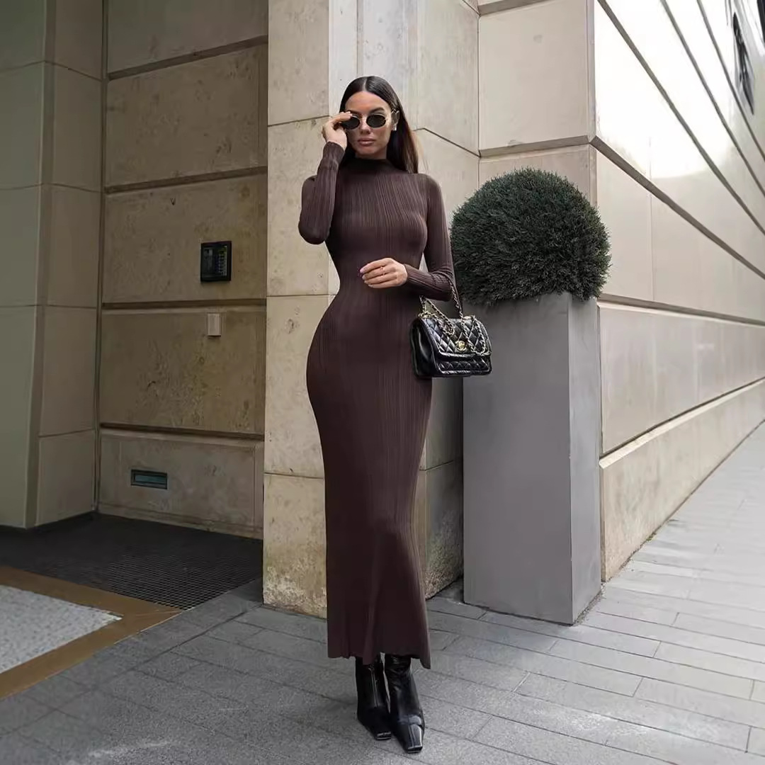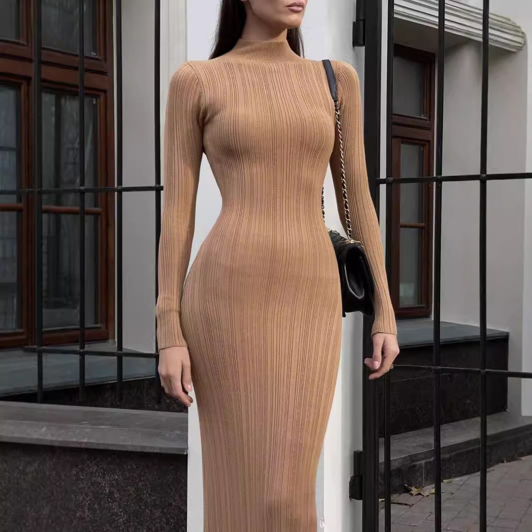 2024 가을과 겨울 긴 소매 니트 치마 높은 칼라 타이트 유럽과 미국의 프랑스 우아한베이스 스트라이프 스웨터 원피스