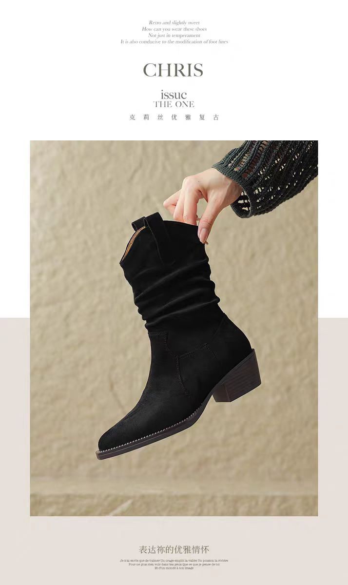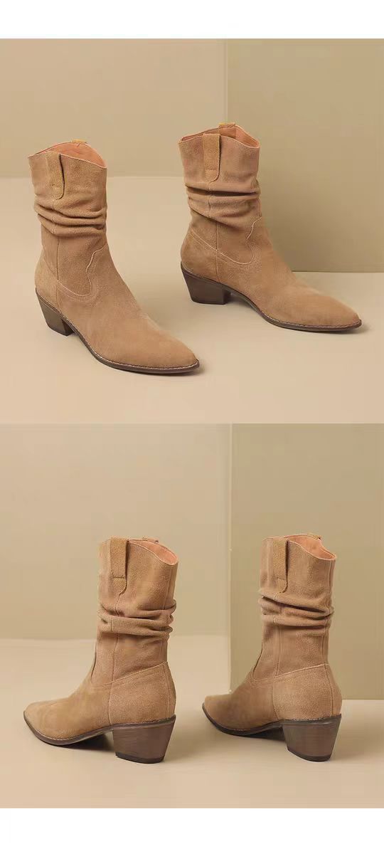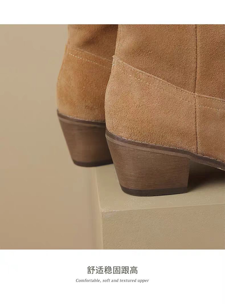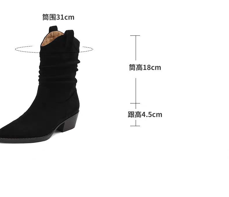 부츠 여성 중반 송아지 나이트 부츠 2024 새로운 마틴 신발 여성 지적 발가락 두꺼운 뒤꿈치 하이힐 짧은 부츠 슬리밍 파일 부츠스토어 가기