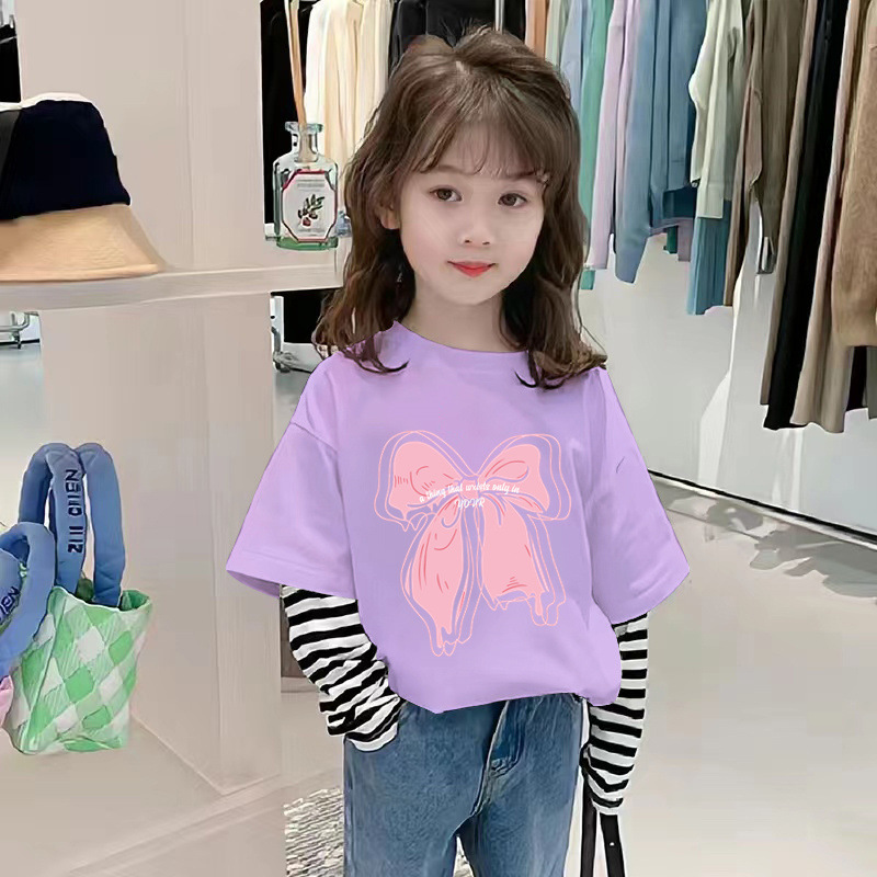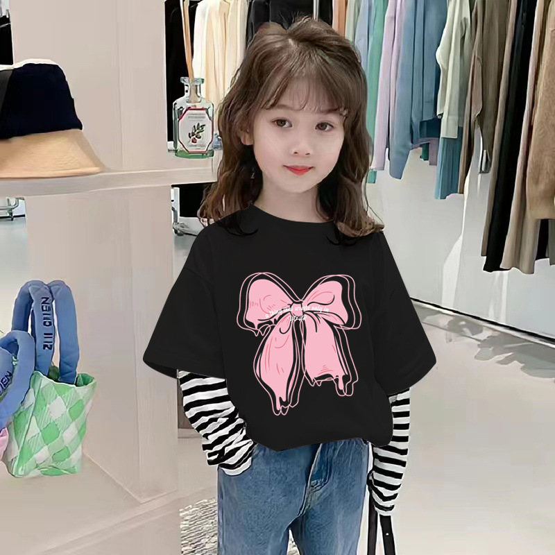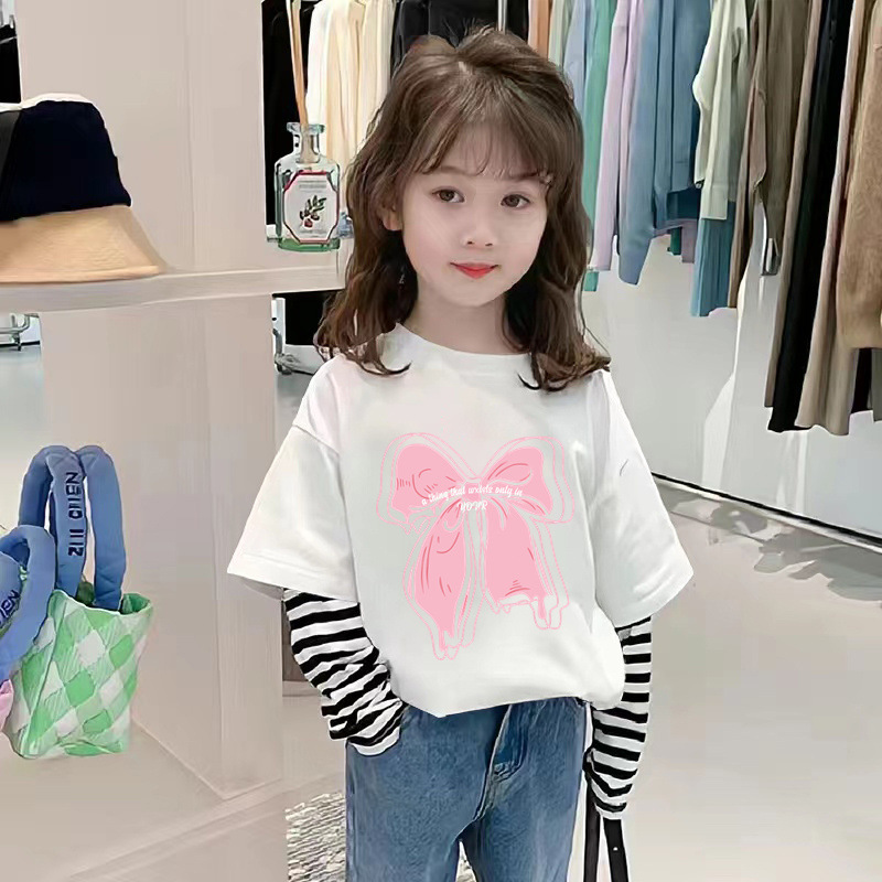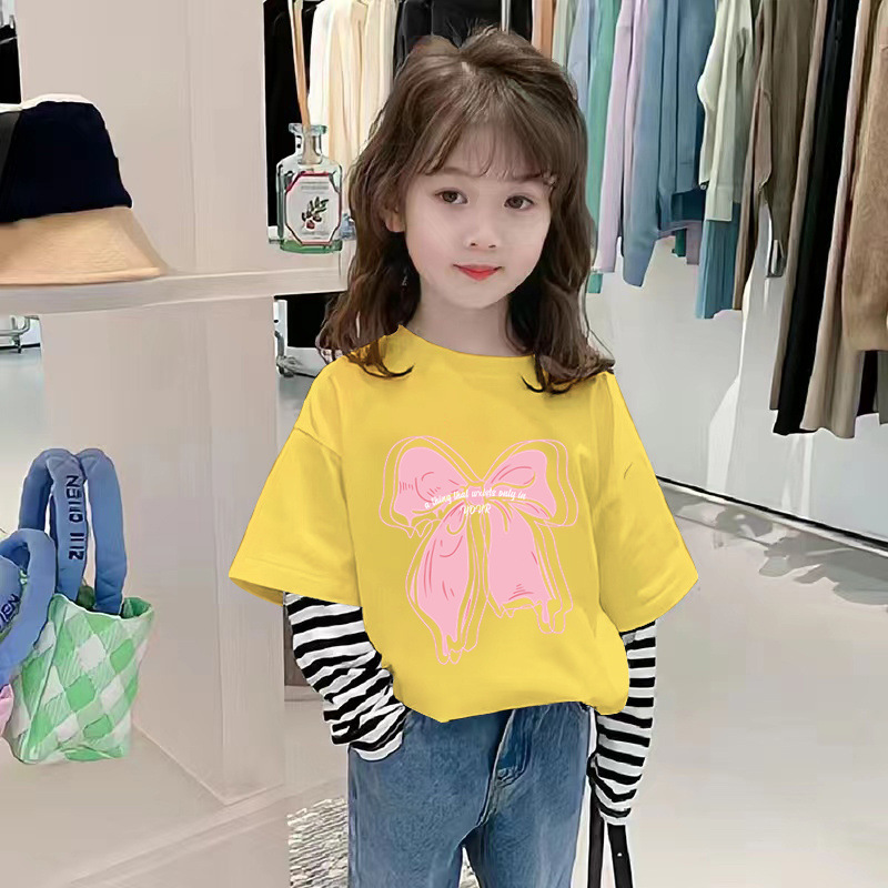 G2242 # 여자 긴팔 면화 티셔츠 가짜 두 가지 새로운 외국 스타일 어린이 가을 티셔츠 재킷 봄과 가을 아동복스토어 가기