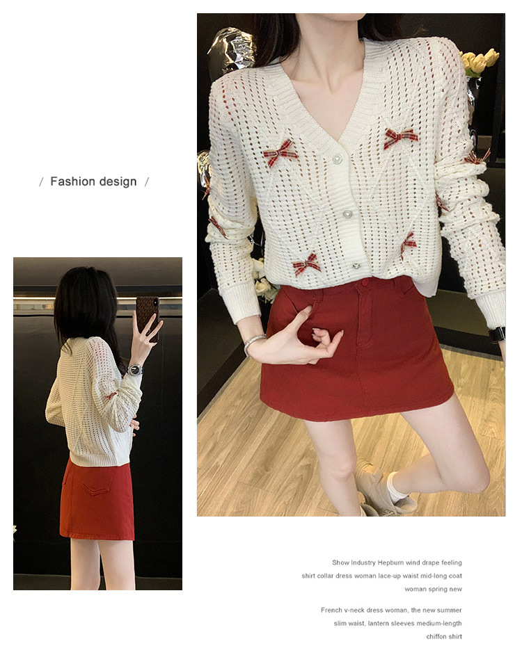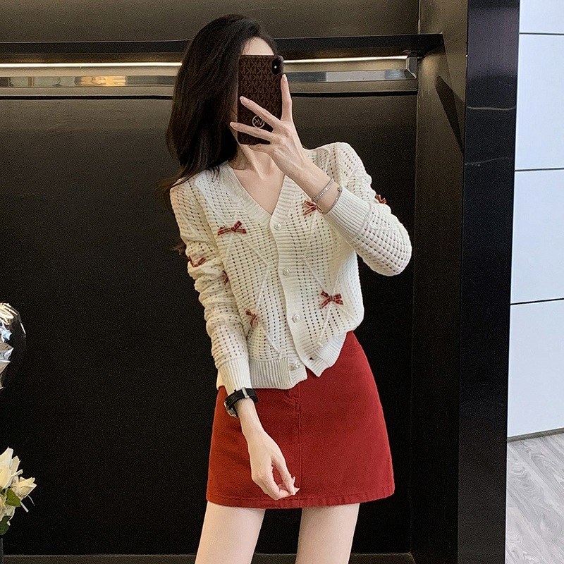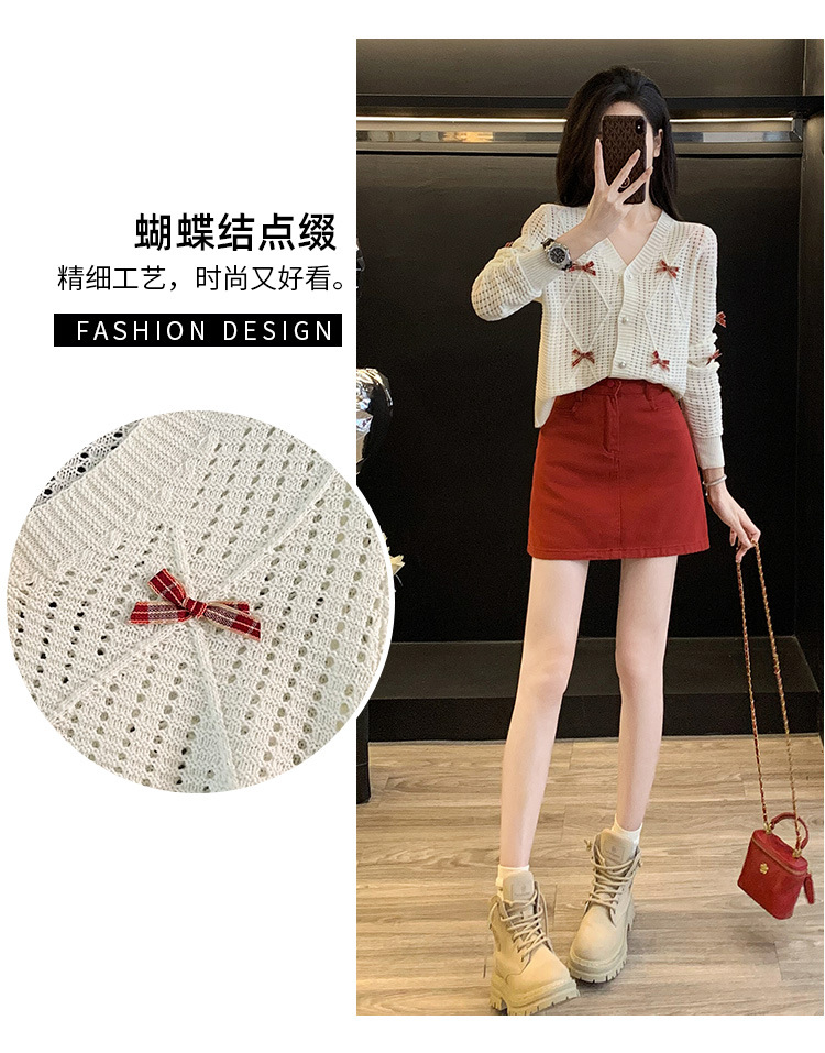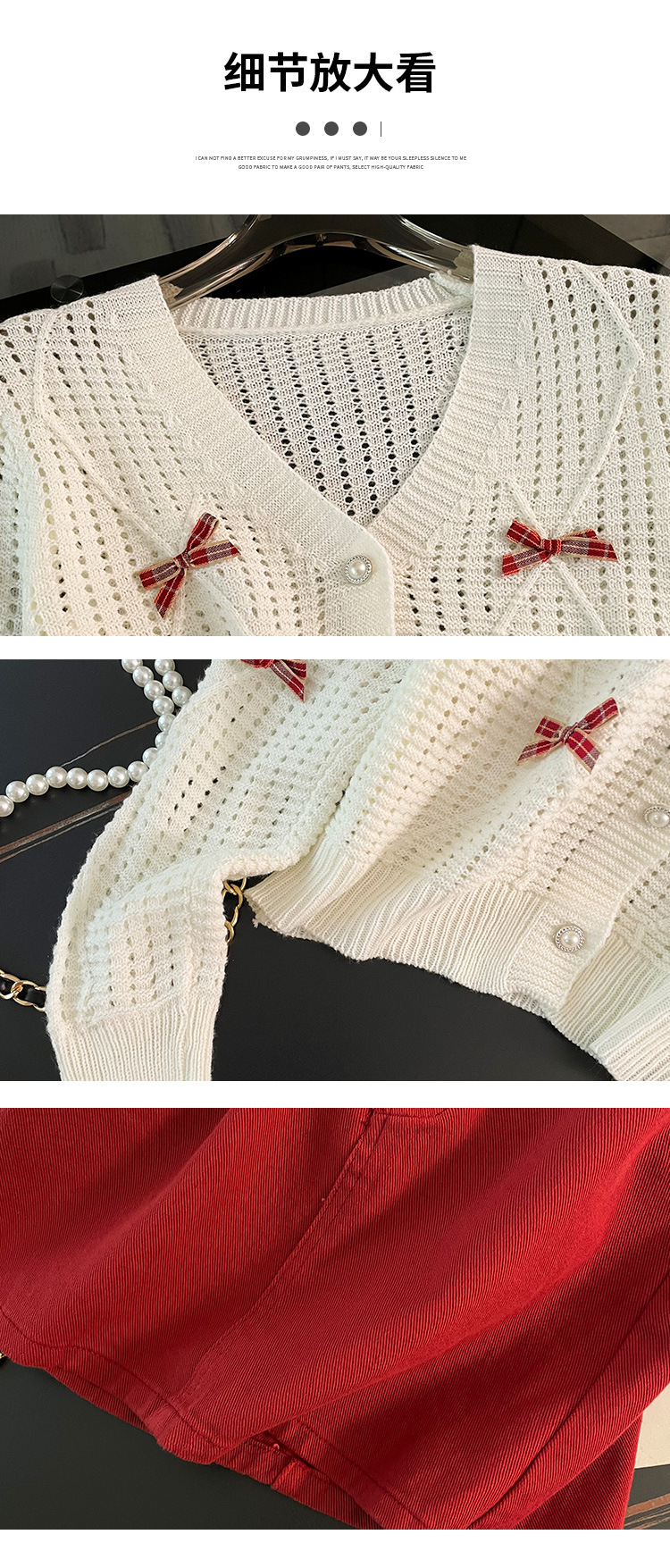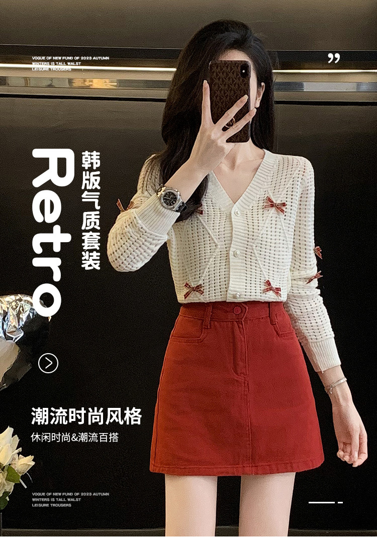 2024 새로운 우아한 작은 슬림 핏 슬리밍 패션 도파민 니트 긴팔 데님 짧은 치마 세트 여성 패션