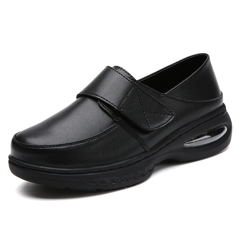 가을 겨울 간호사 신발, 천연 가죽 여성용 에어쿠션 소프트 밑창 통기성 미끄럼 방지 검정 작업화 도매 및 직배송