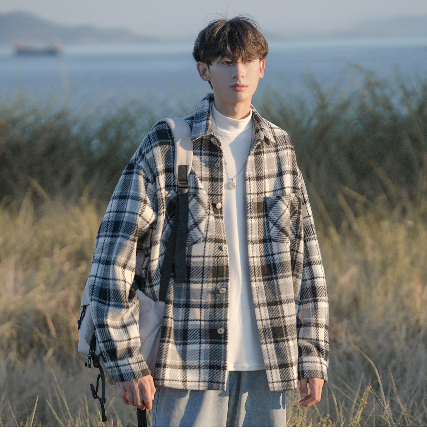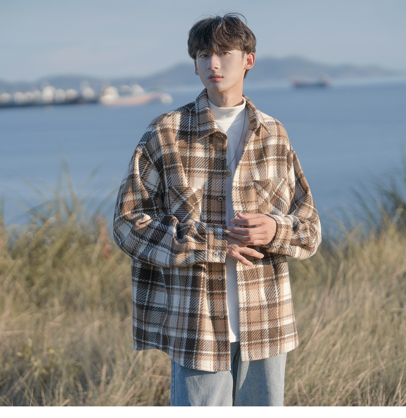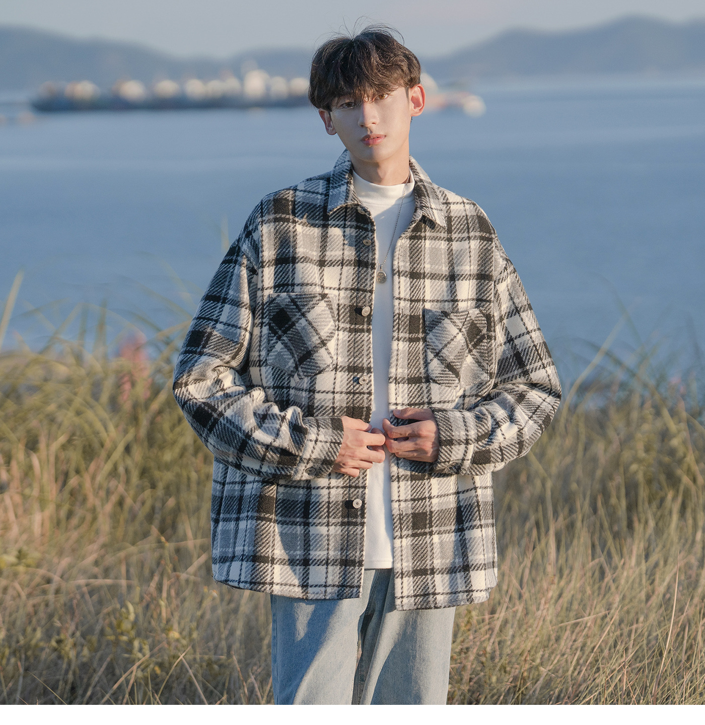모직 격자 무늬 옷깃 코트 남자 홍콩 스타일 시티 보이 셔츠 재킷 봄과 가을 느슨한 올 매치 청소년 감각 셔츠스토어 가기