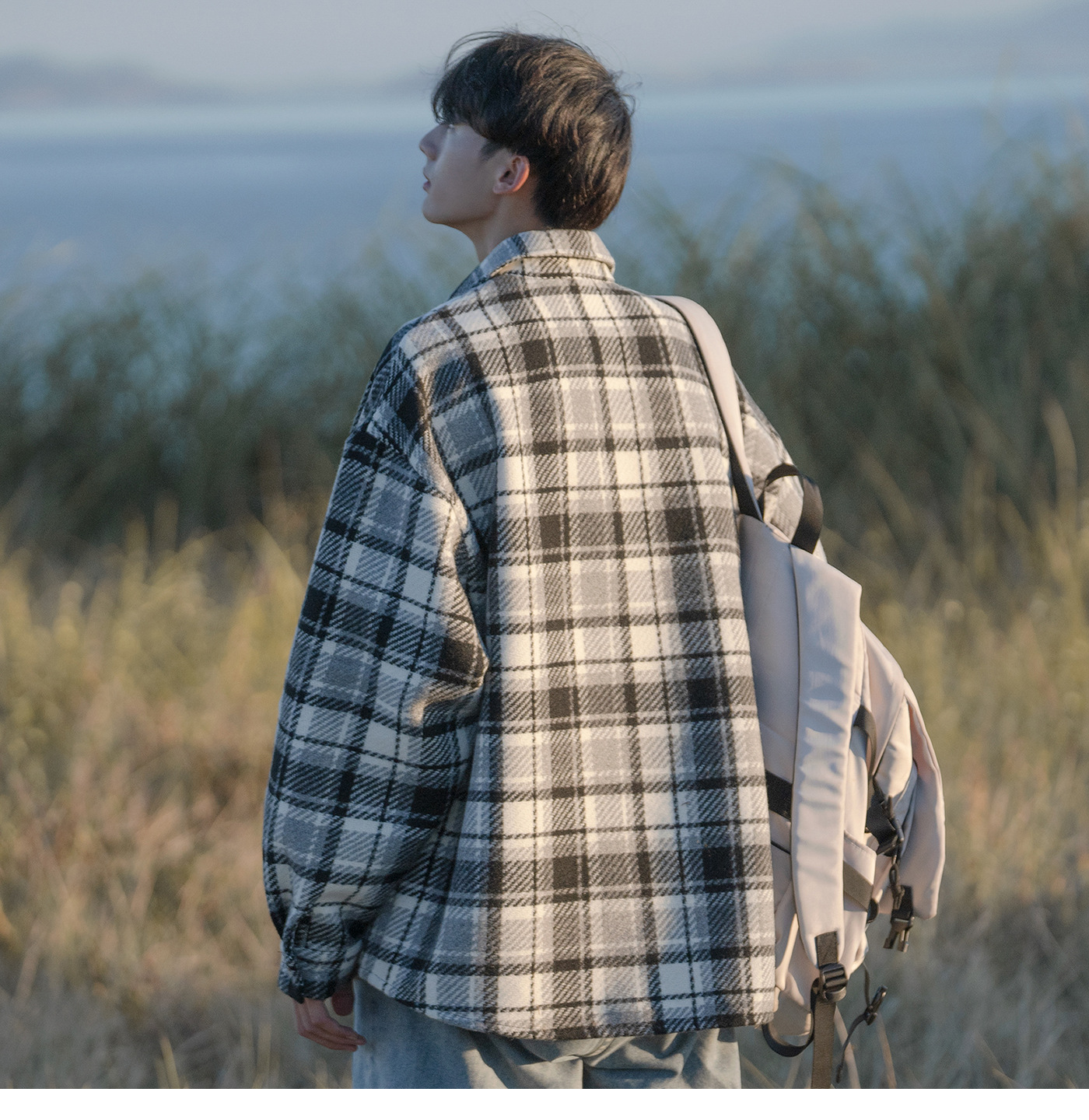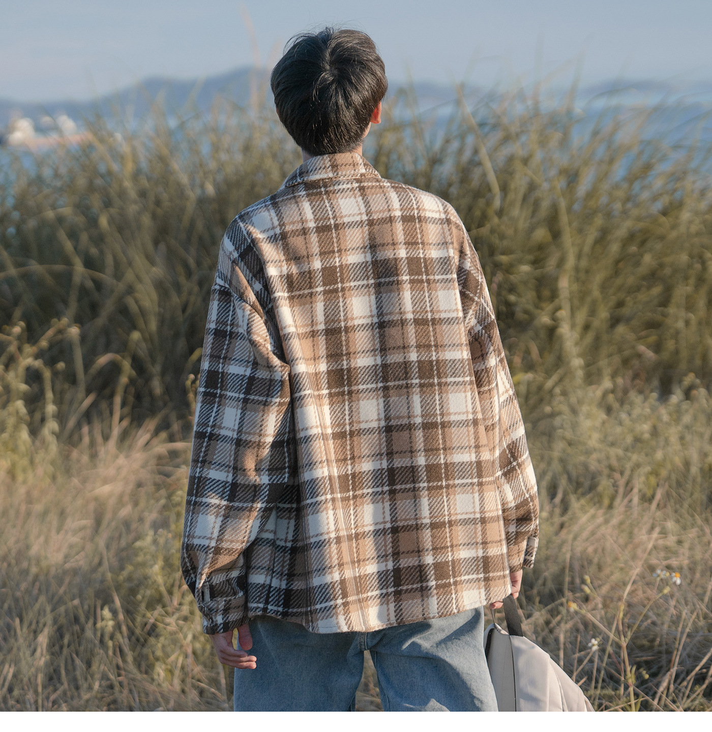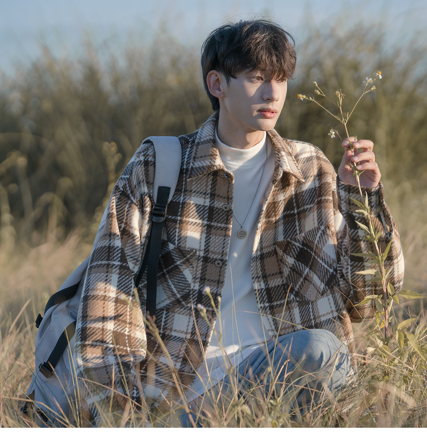 모직 격자 무늬 옷깃 코트 남자 홍콩 스타일 시티 보이 셔츠 재킷 봄과 가을 느슨한 올 매치 청소년 감각 셔츠스토어 가기