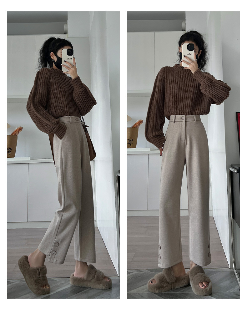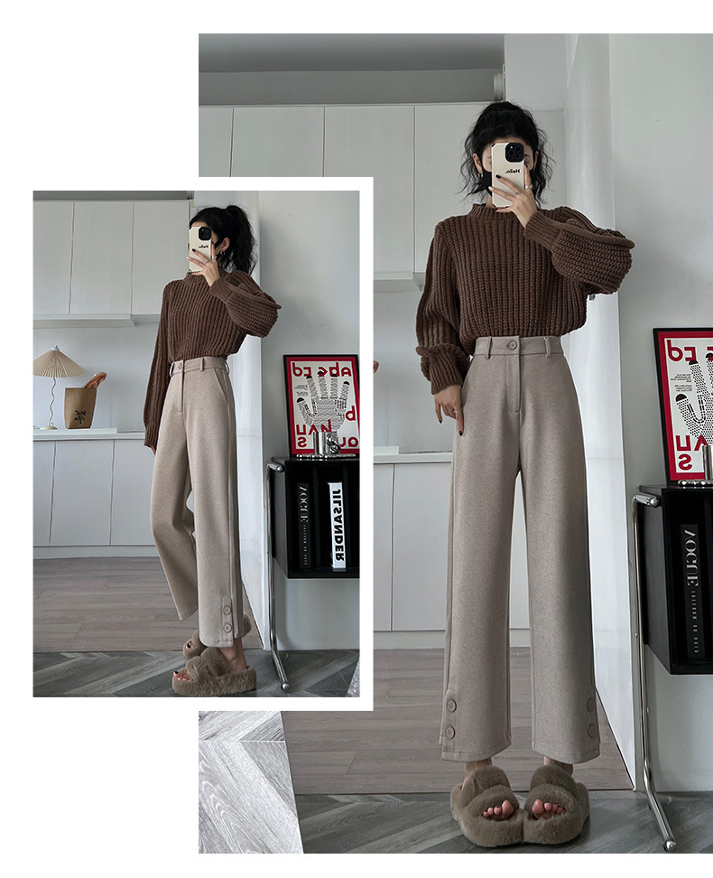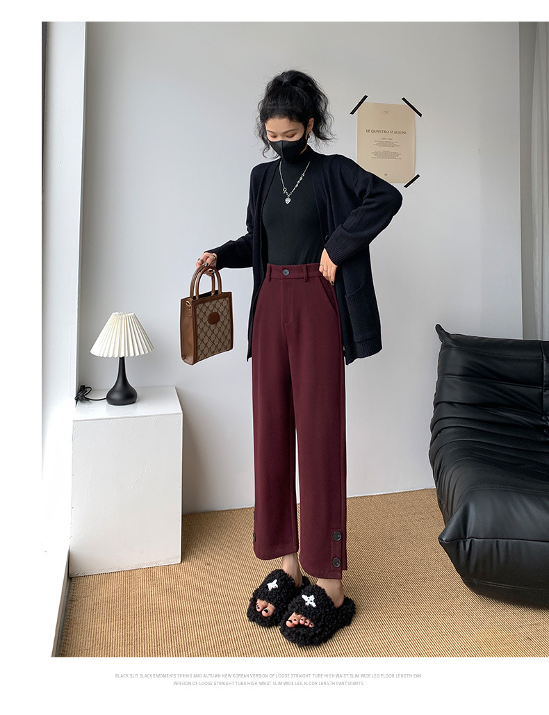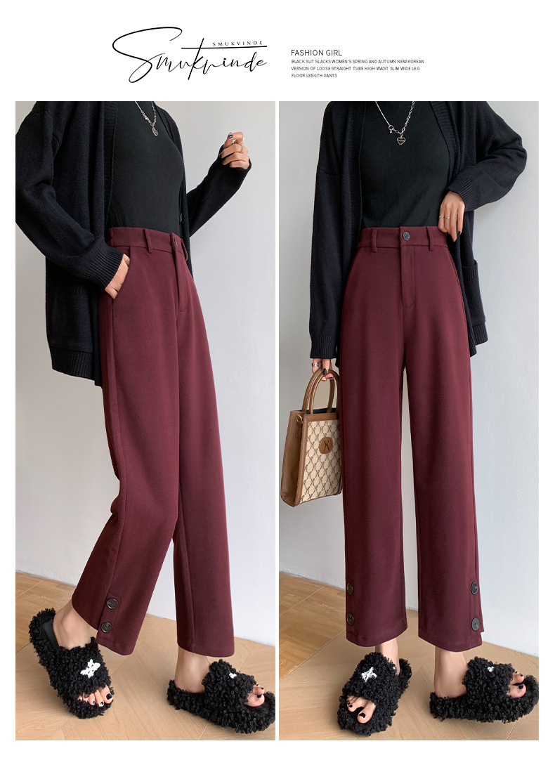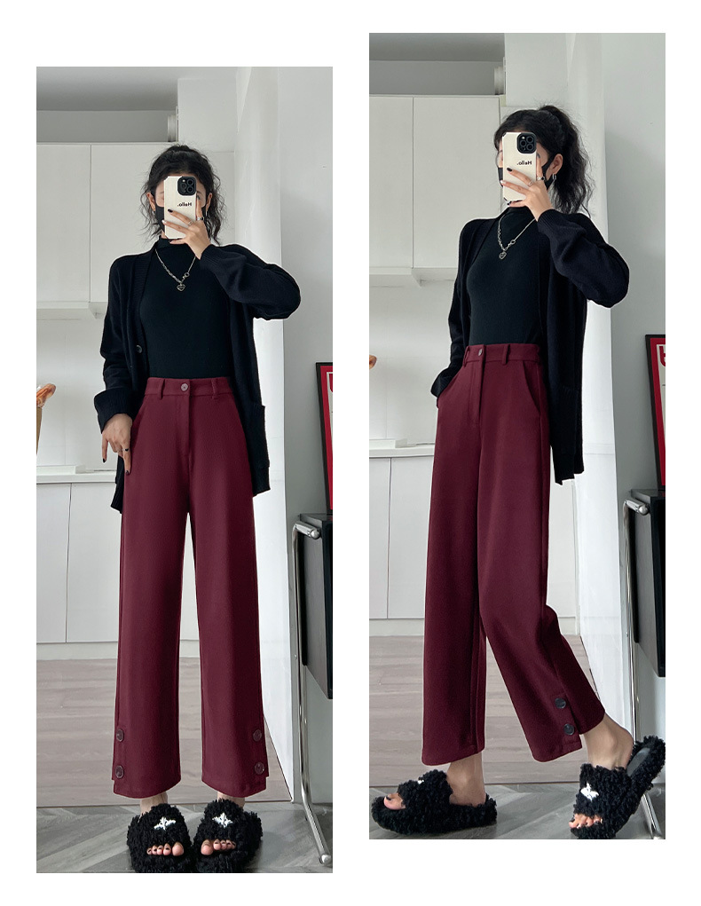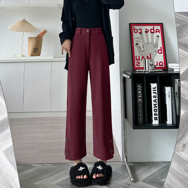 진짜 샷 2024 가을과 겨울 빨간 양모 자른 스트레이트 바지 작은 높은 허리 슬리밍 캐주얼 느슨한 넓은 다리 바지스토어 가기