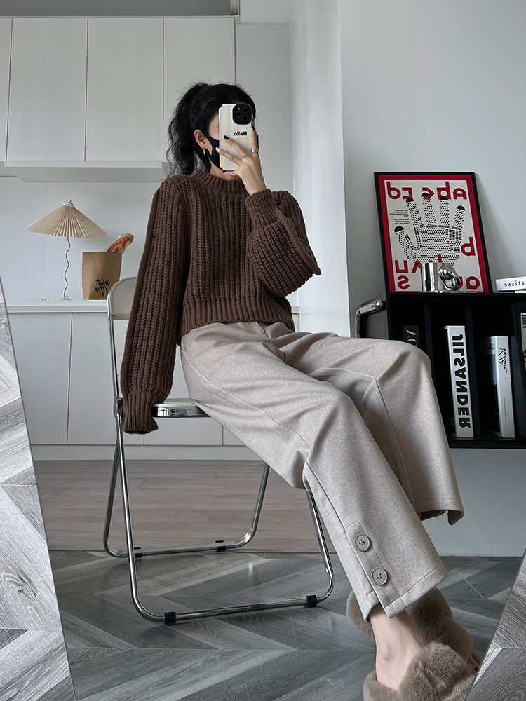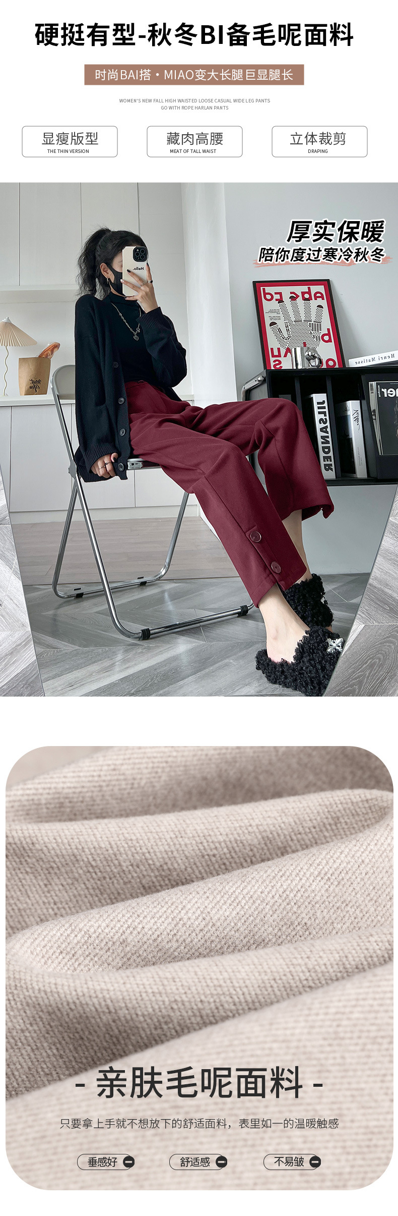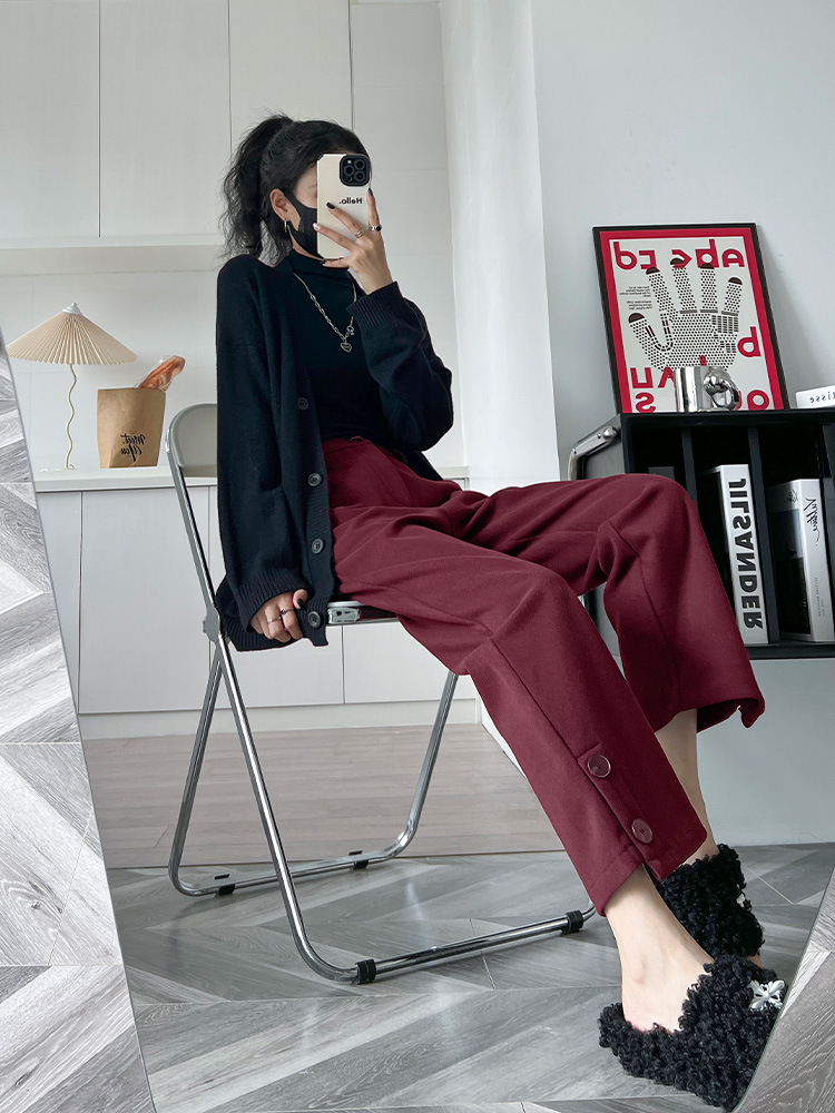 진짜 샷 2024 가을과 겨울 빨간 양모 자른 스트레이트 바지 작은 높은 허리 슬리밍 캐주얼 느슨한 넓은 다리 바지