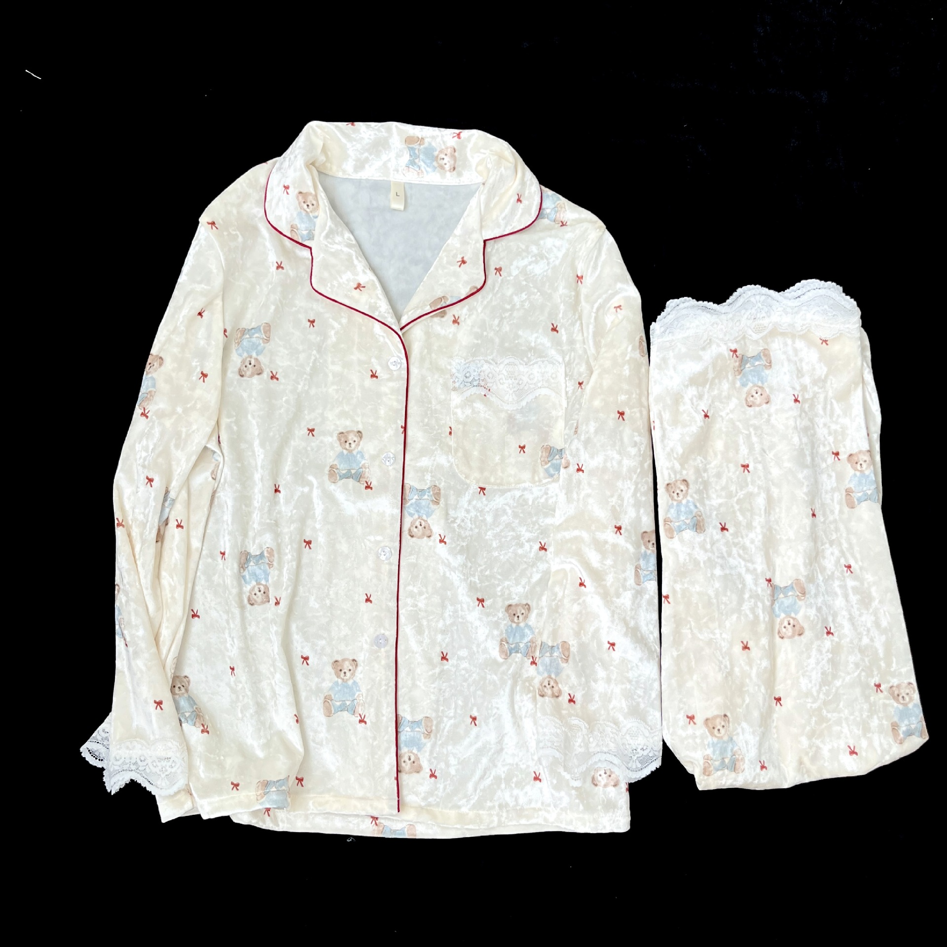 [골든 벨벳 굿나잇 베어] 가을과 겨울 뉴 골드 다이아몬드 벨벳 파자마 여성 긴팔 달콤한 귀여운 곰 홈 옷