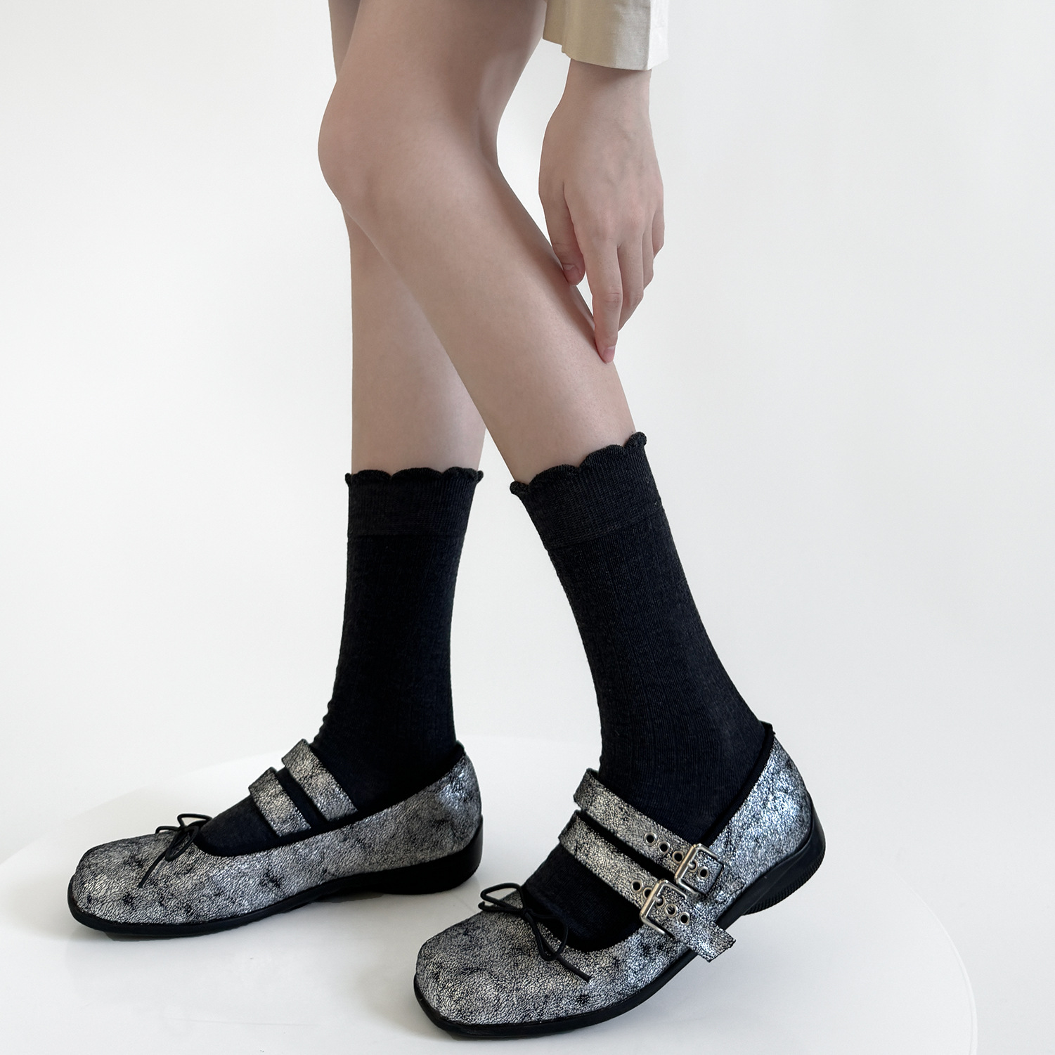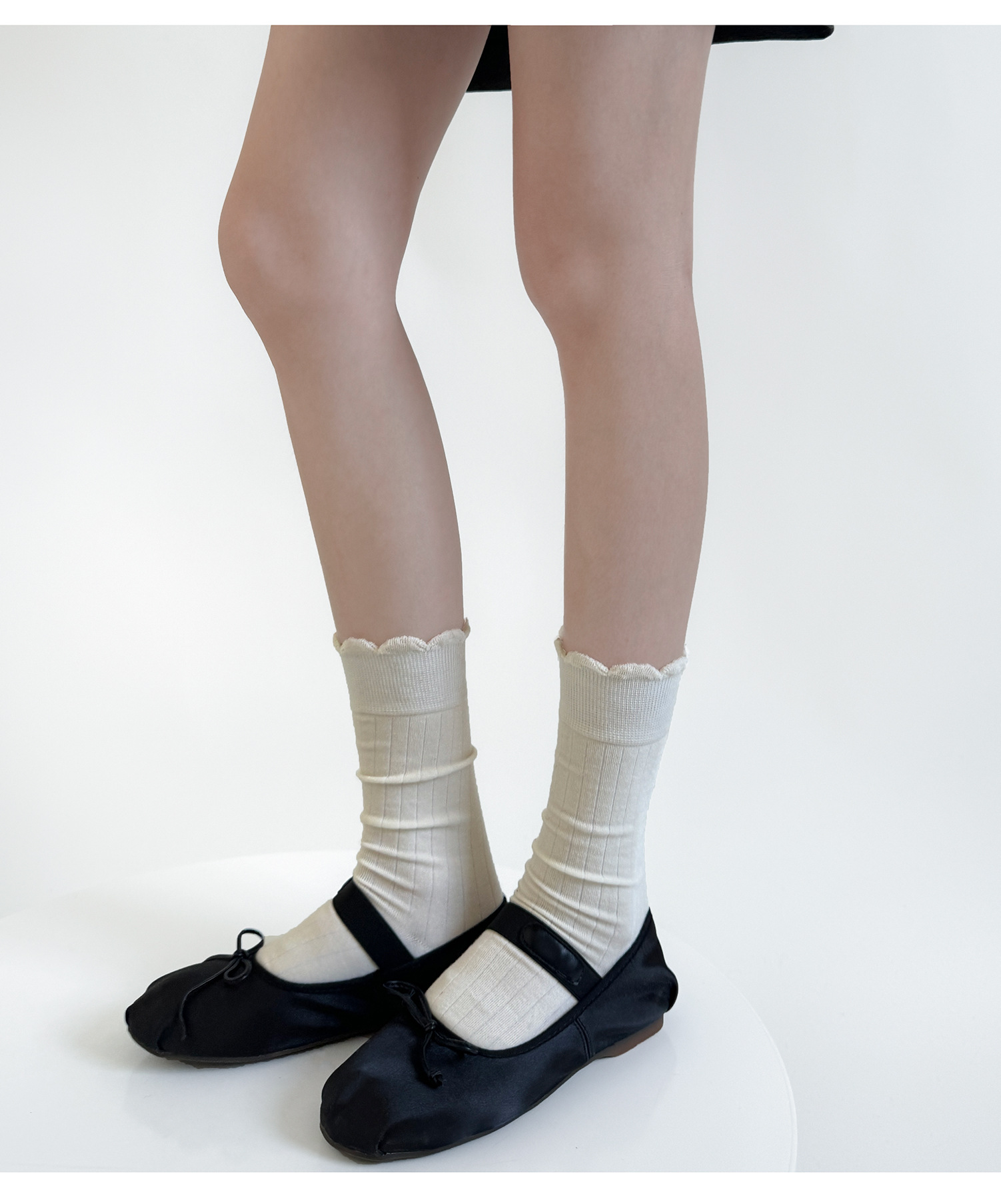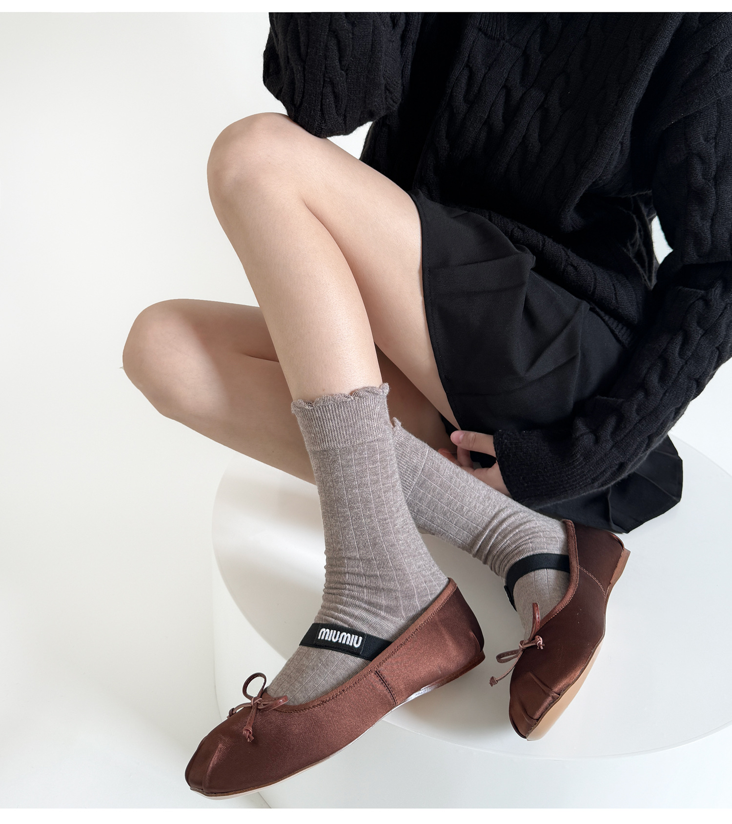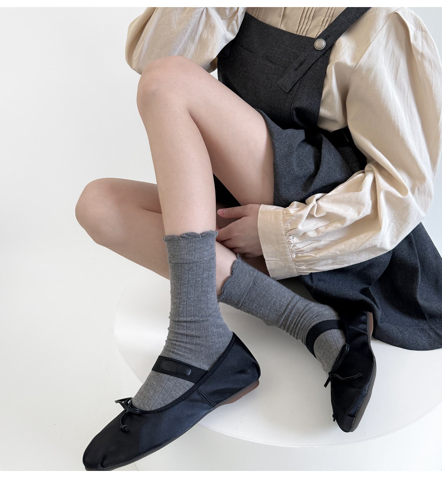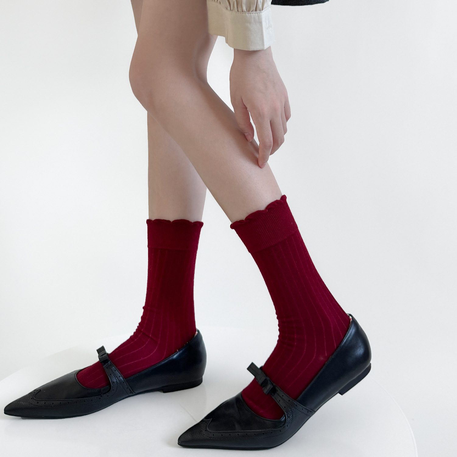 가을 겨울 달콤한 세로 줄무늬 중목 양말 여성용 버건디 레이스 무봉제 부드러운 양말 울 그레이 숏삭스 봄 가을용