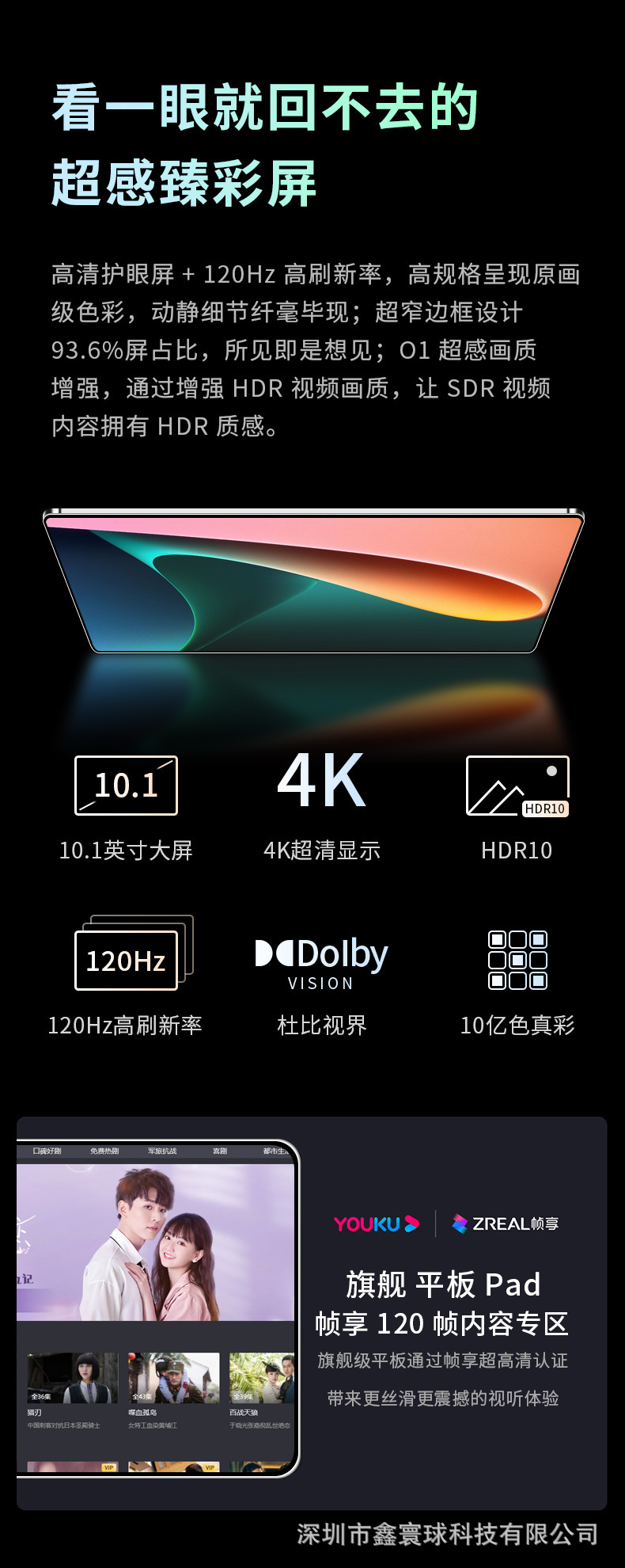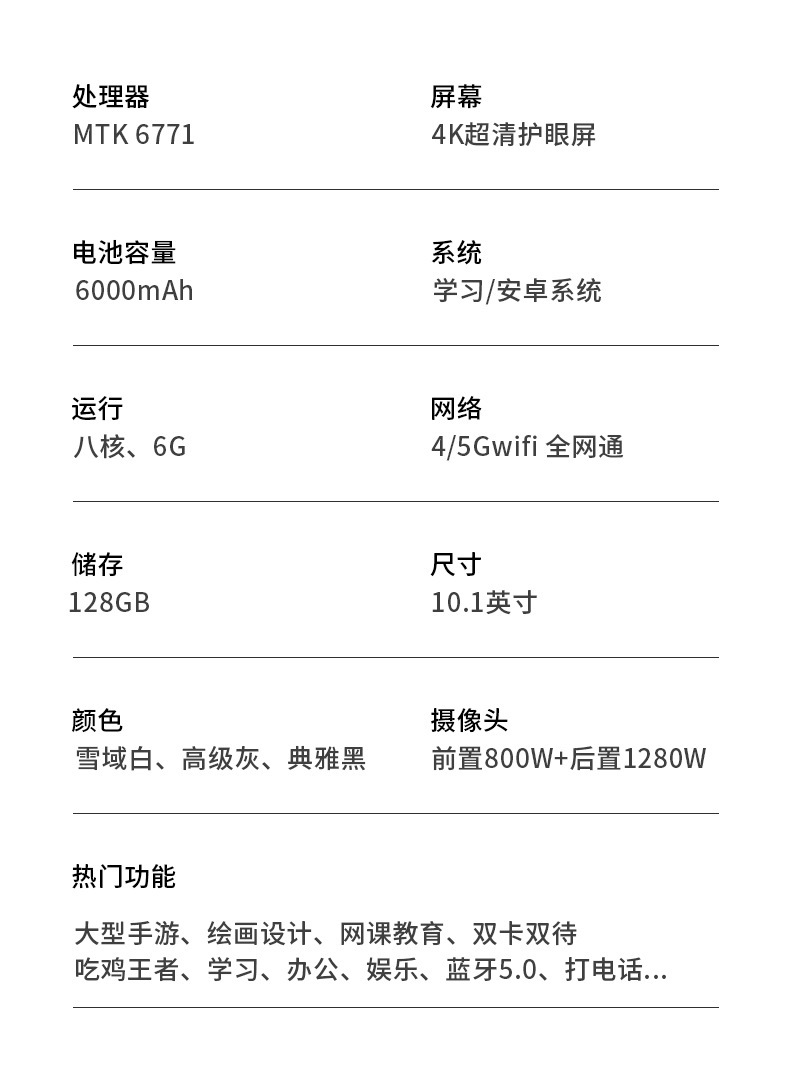 屏幕尺寸:10.1寸IPS高清屏(显示屏采用曲线优美的圆角设计, 英寸是显示屏圆角拉伸为直角时的对角线长度)