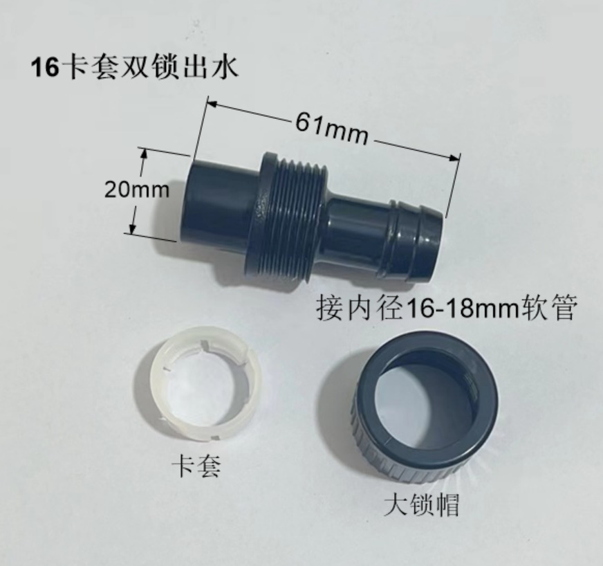 双锁扣款快接:用于硬管与软管的转换接头,常与软管、阀门、强排等相应口径的配件结合使用。快接含螺纹、卡套、大螺帽,则与组合的配件易连接,双重加固更不易脱落。发货均为散件,客户自行组装。