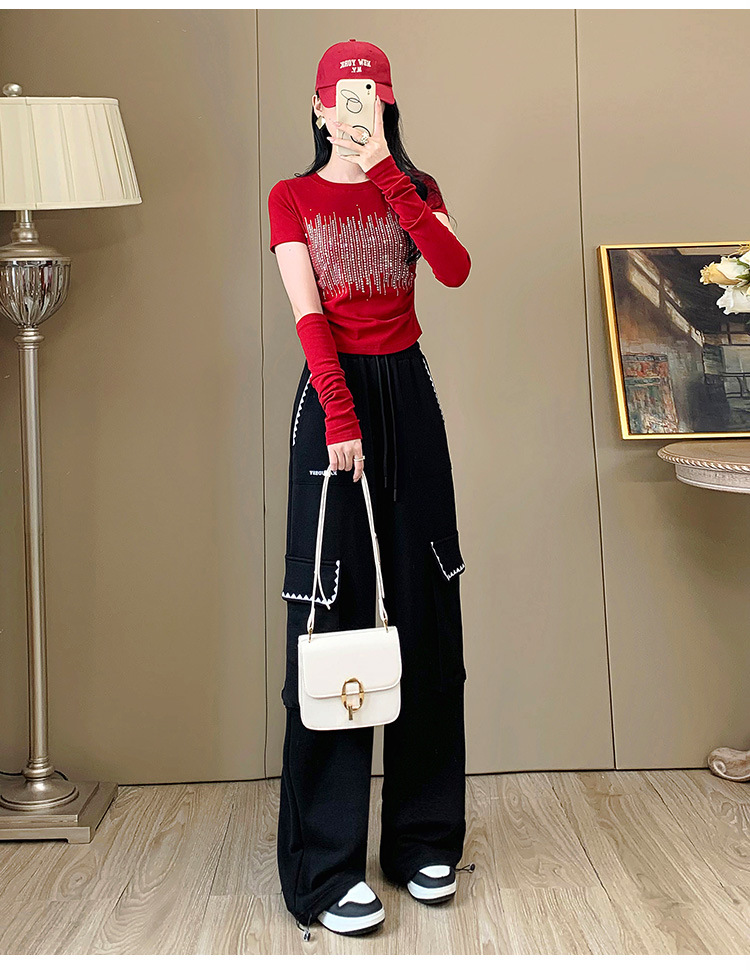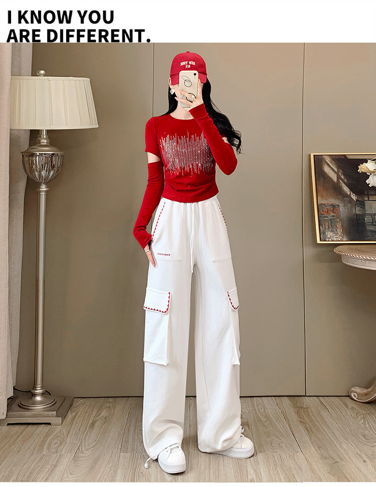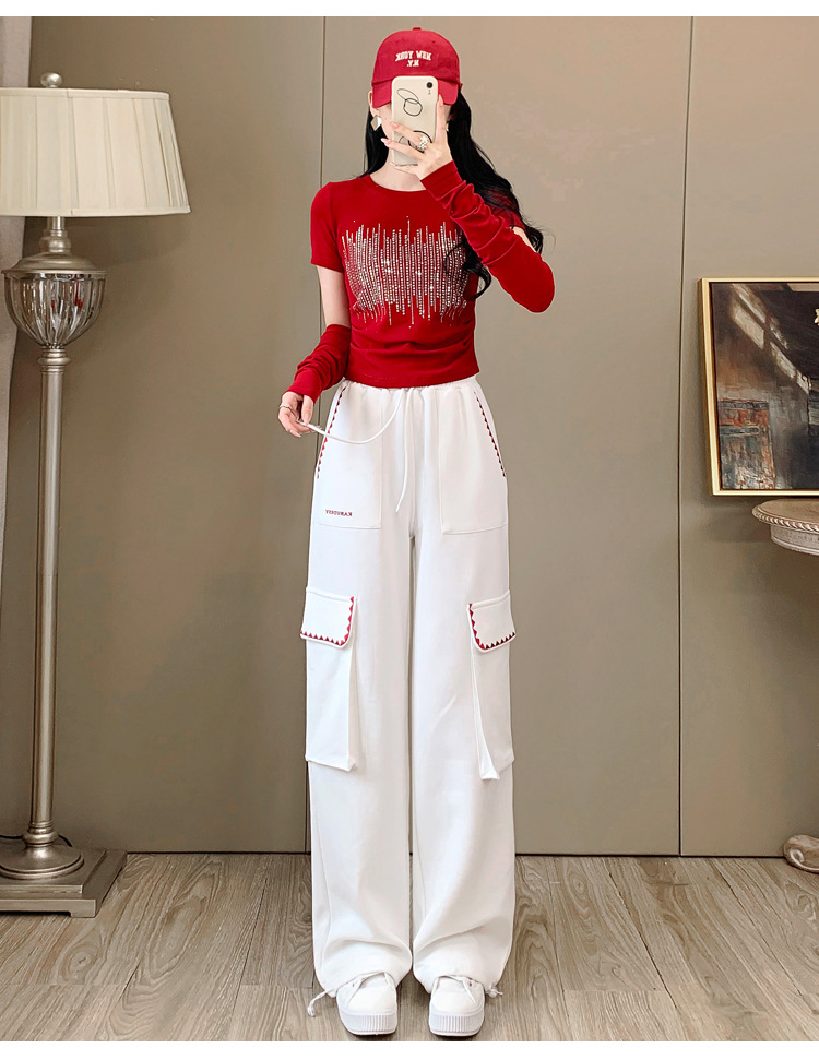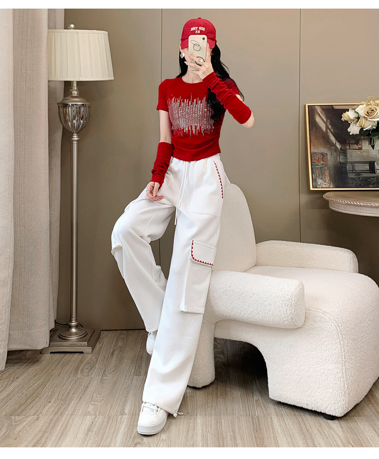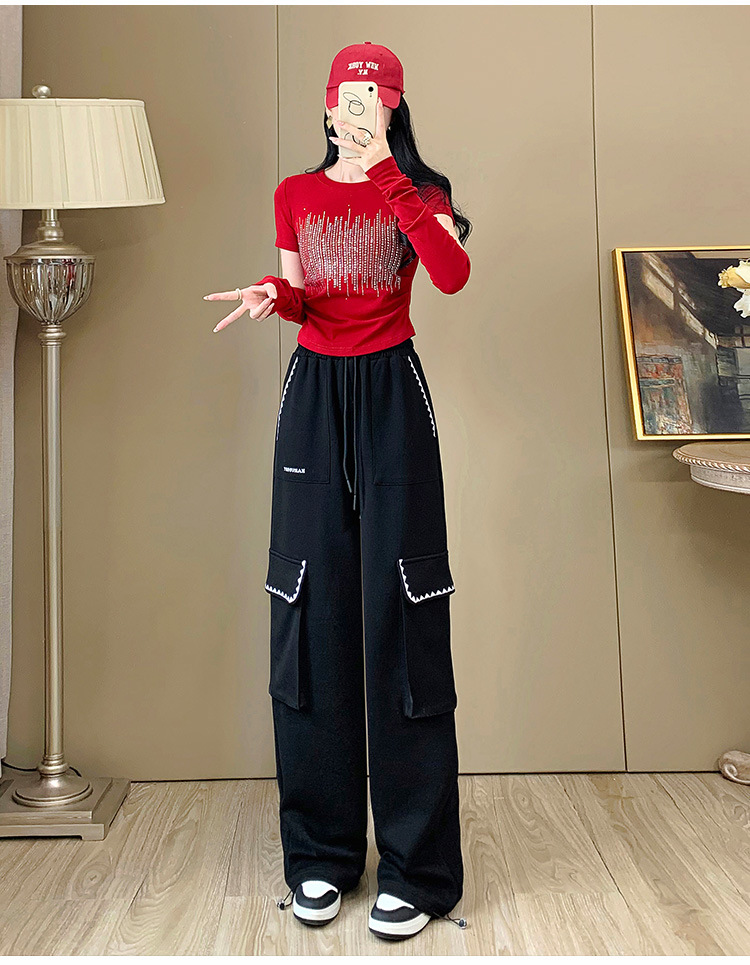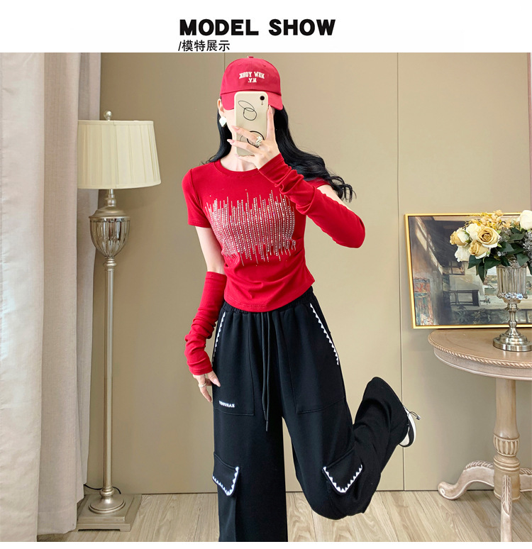 패션 스포츠 세트 여성의 가을과 겨울 2024 새로운 튀김 거리 패션 분해 소매 티셔츠 슬림 바지 투피스 세트