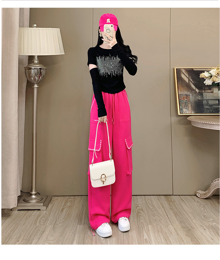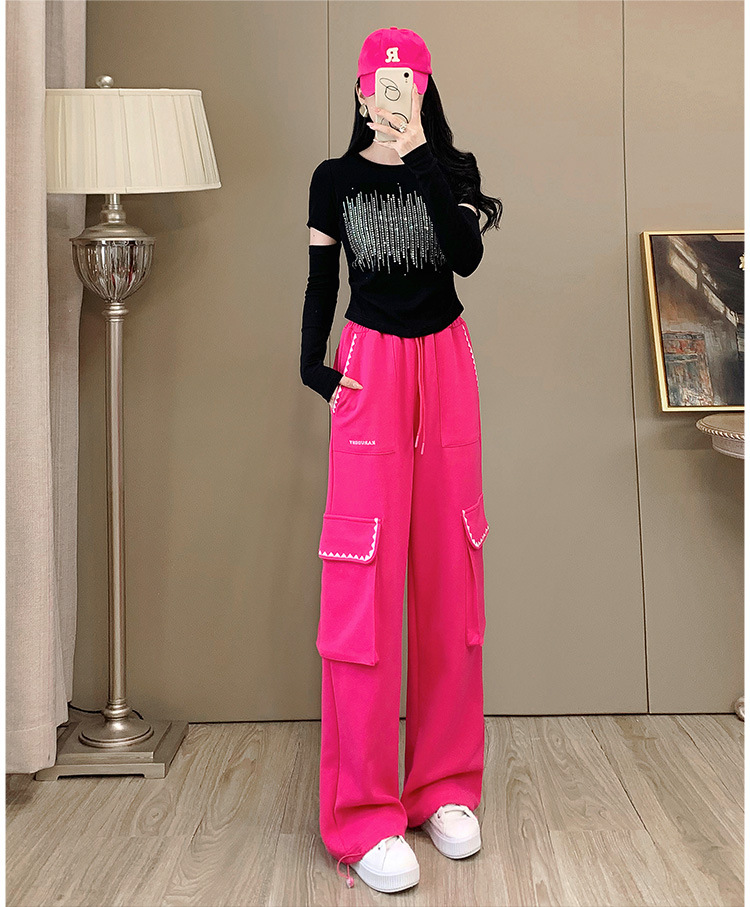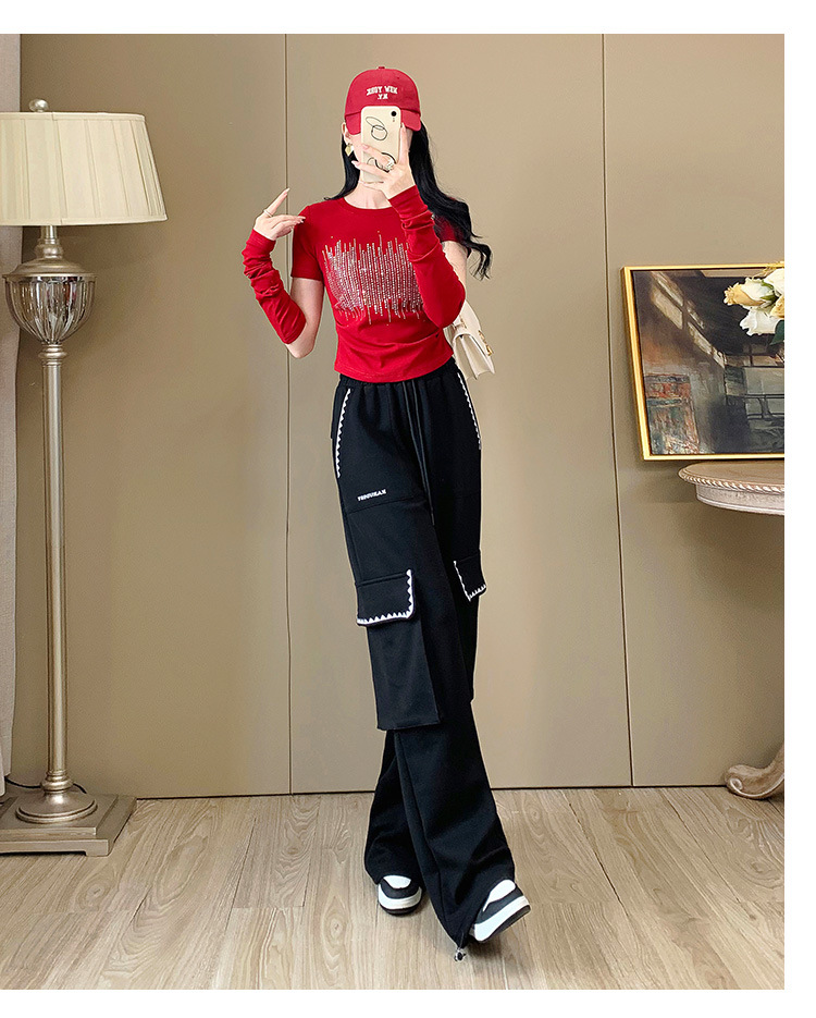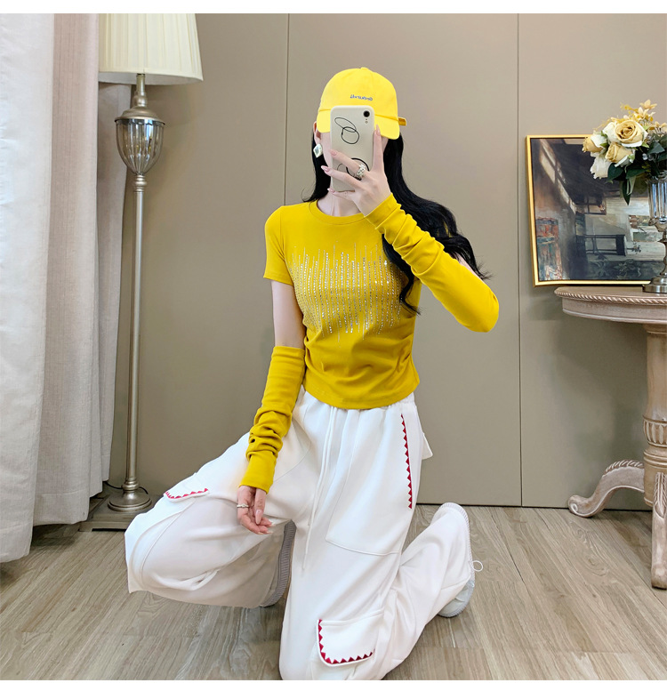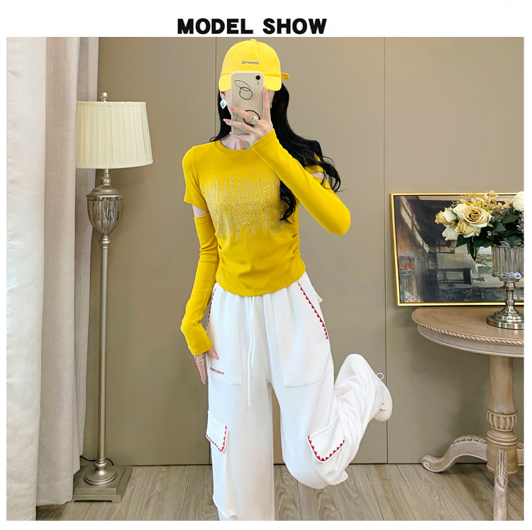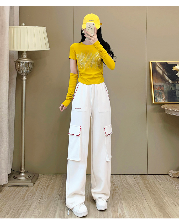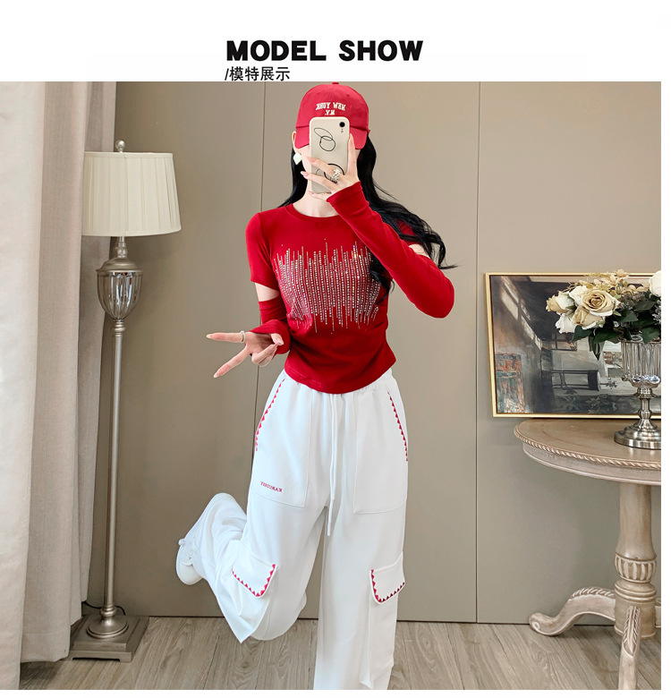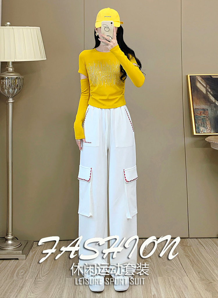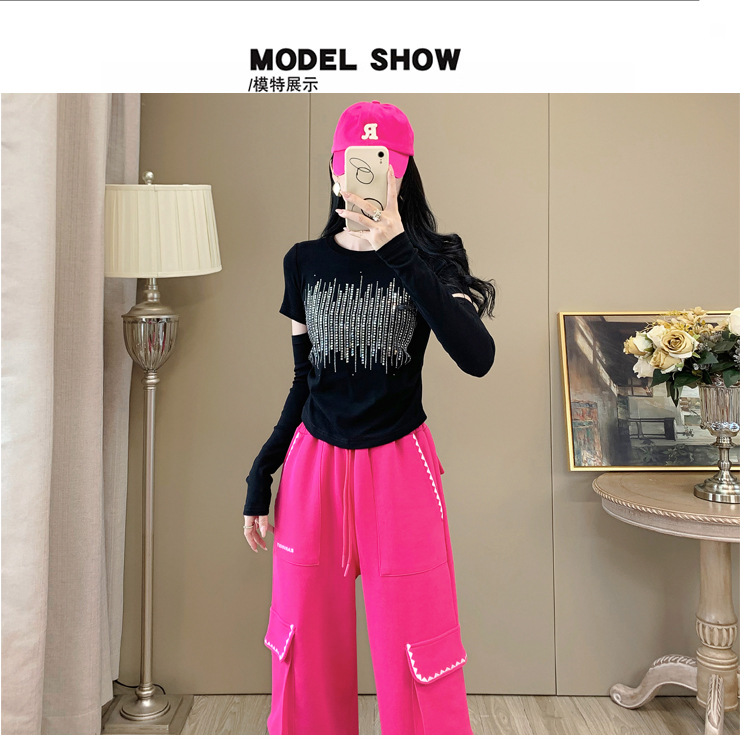 패션 스포츠 세트 여성의 가을과 겨울 2024 새로운 튀김 거리 패션 분해 소매 티셔츠 슬림 바지 투피스 세트스토어 가기