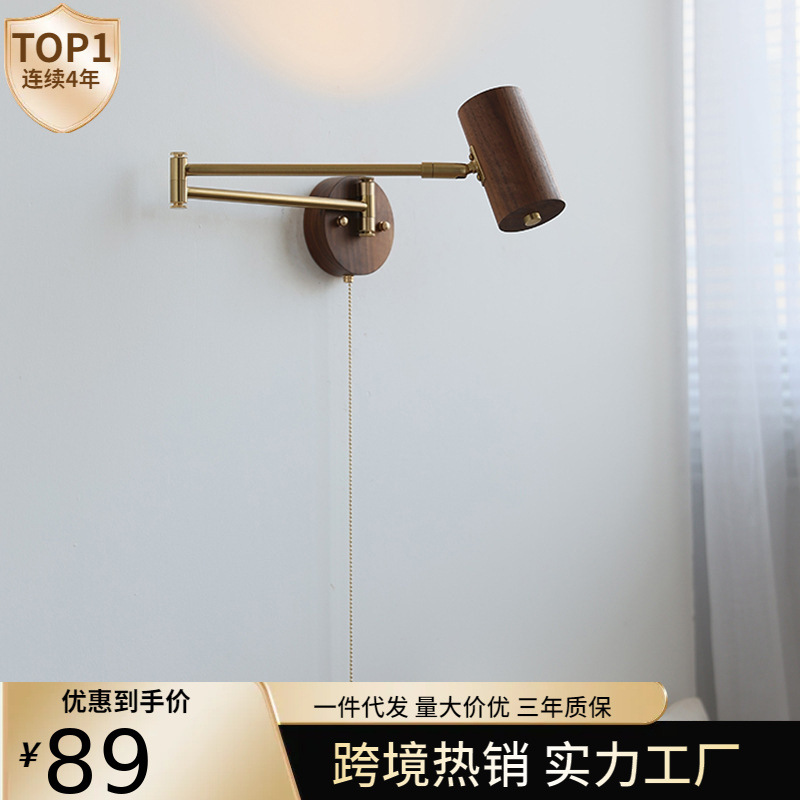일본식 호두 오리지널 우드 사일런트 스타일 창조적 인 로커 팔 긴 팔 연구 독서 램프 침실 침실 벽 램프 스위치