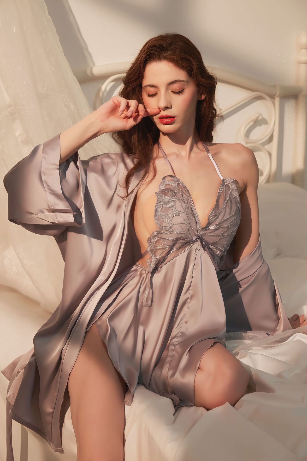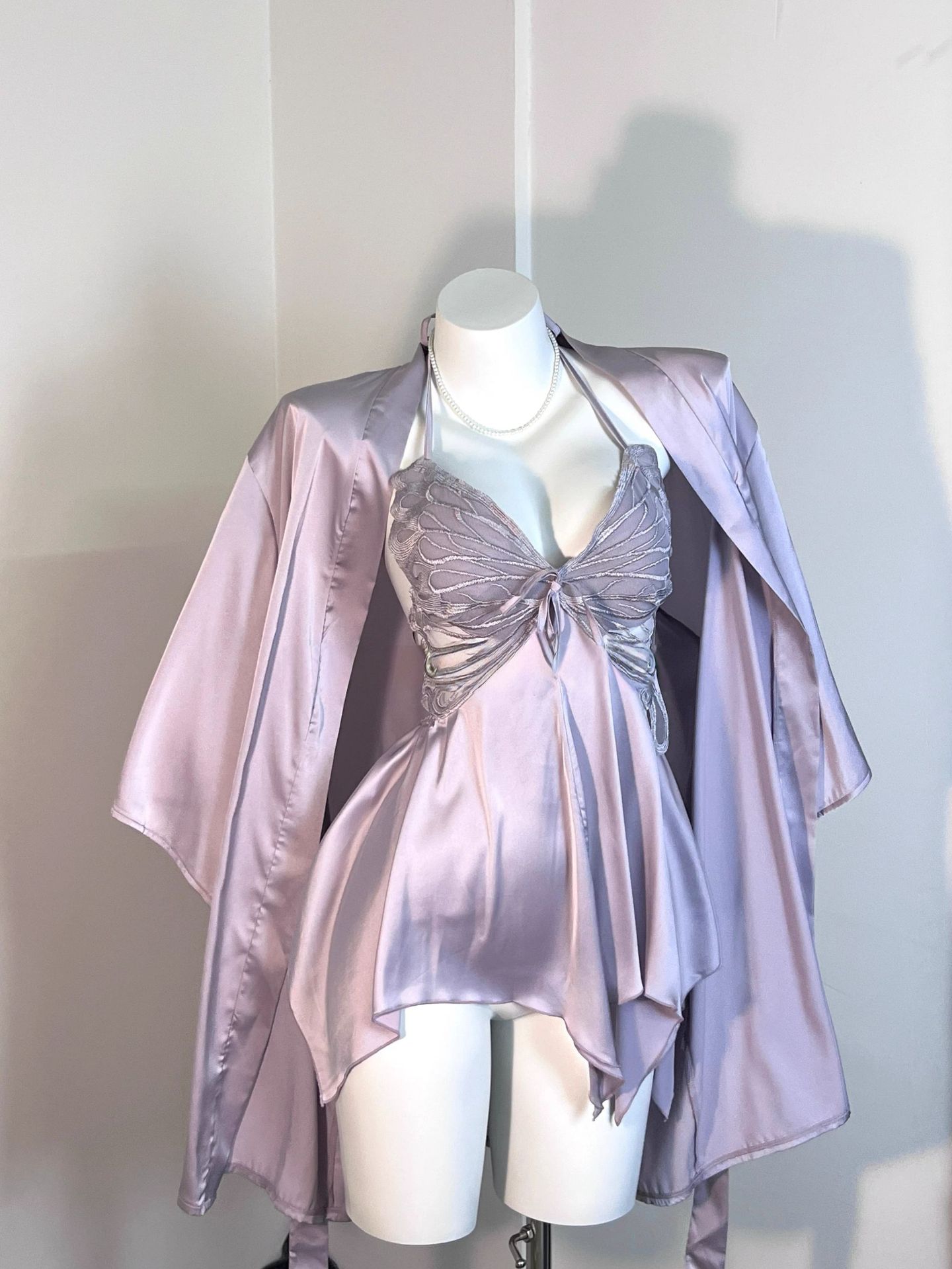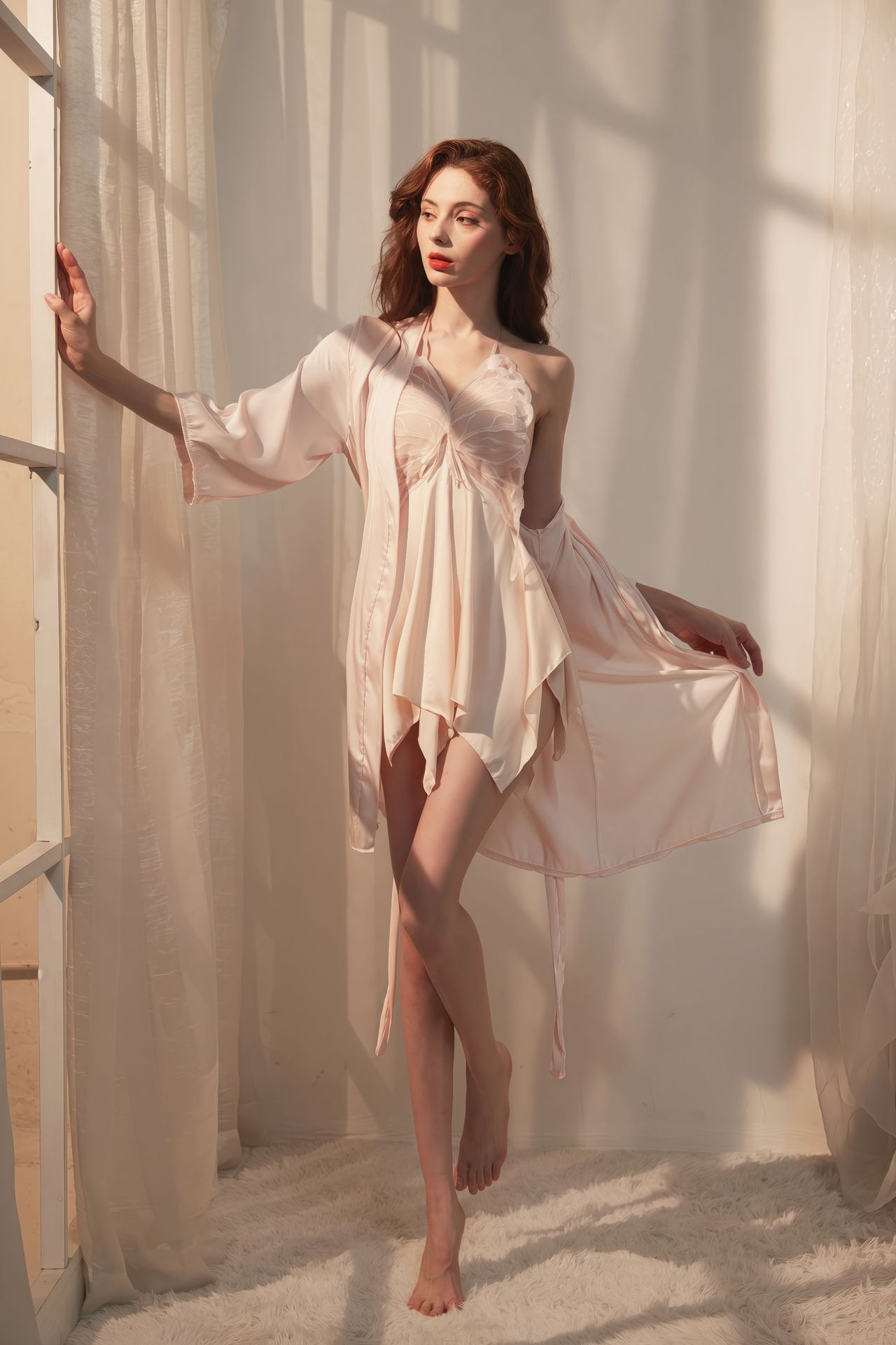 가슴 패드가 있는 섹시한 여성용 잠옷, 가을 고급스러운 느낌의 순수한 매력 리본 큰 사이즈 끈이 있는 아이스 실크 홈웨어