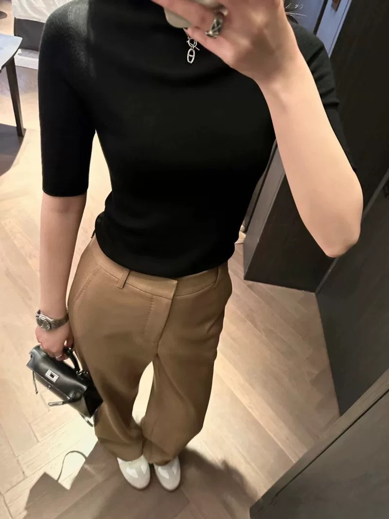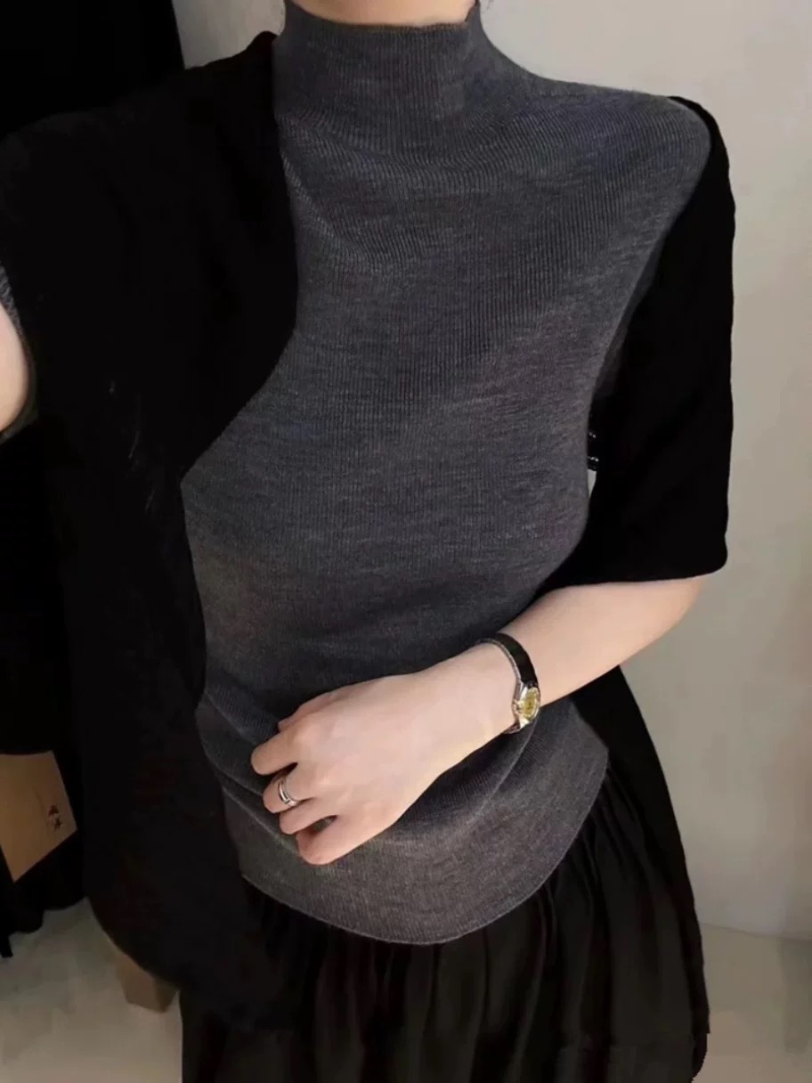 매끈한 풀 모양의 양쯔 원사 캐시미어 여성용 하프 하이 칼라 하프 슬리브 베이스 레이어 셔츠 슬림 핏 탑 반소매 스웨터스토어 가기