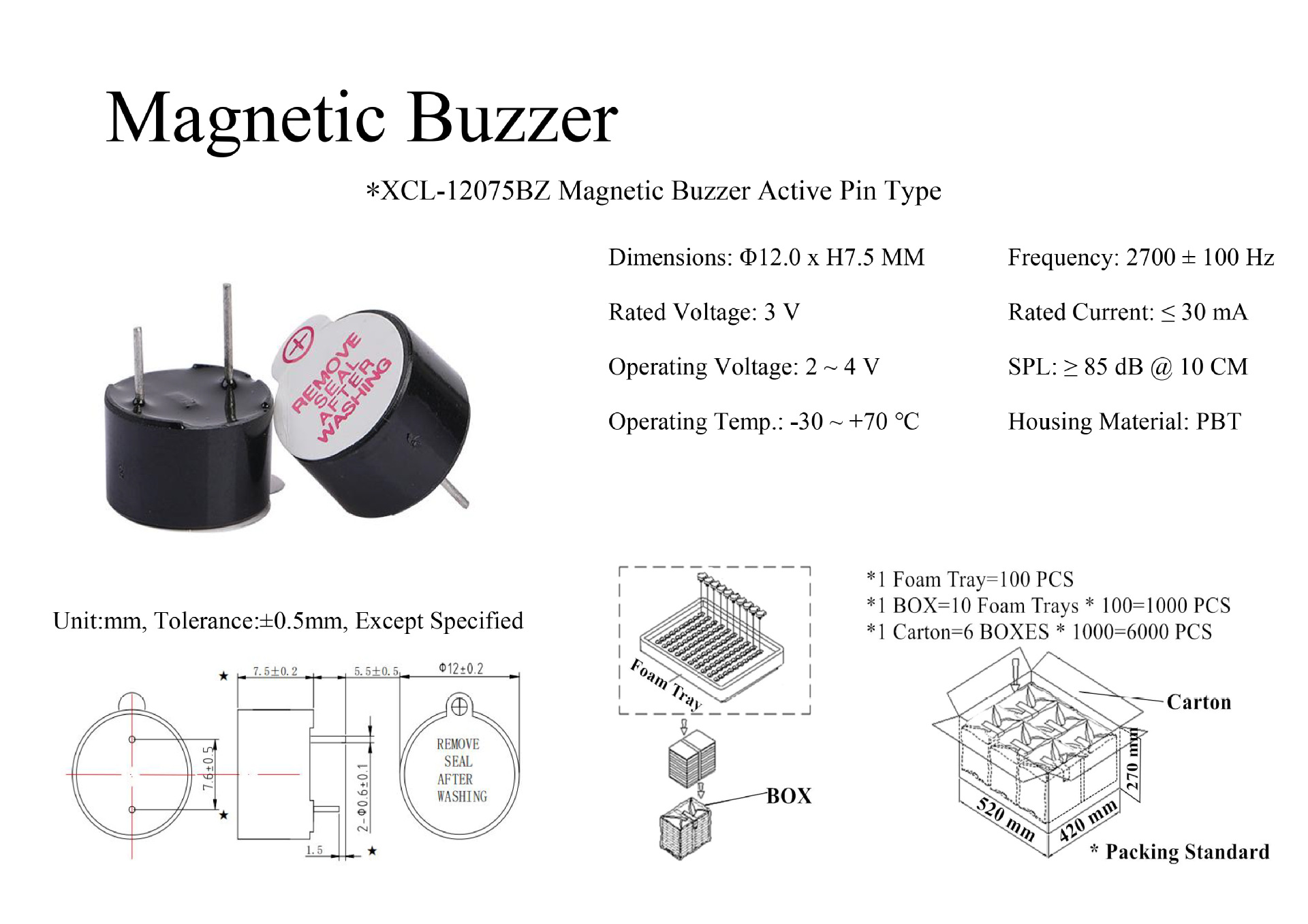 XCL-1275BZ 전자기 버저 12075 라운드 핀 통합 활성 3V 소스 공장 도매스토어 가기