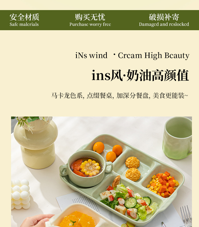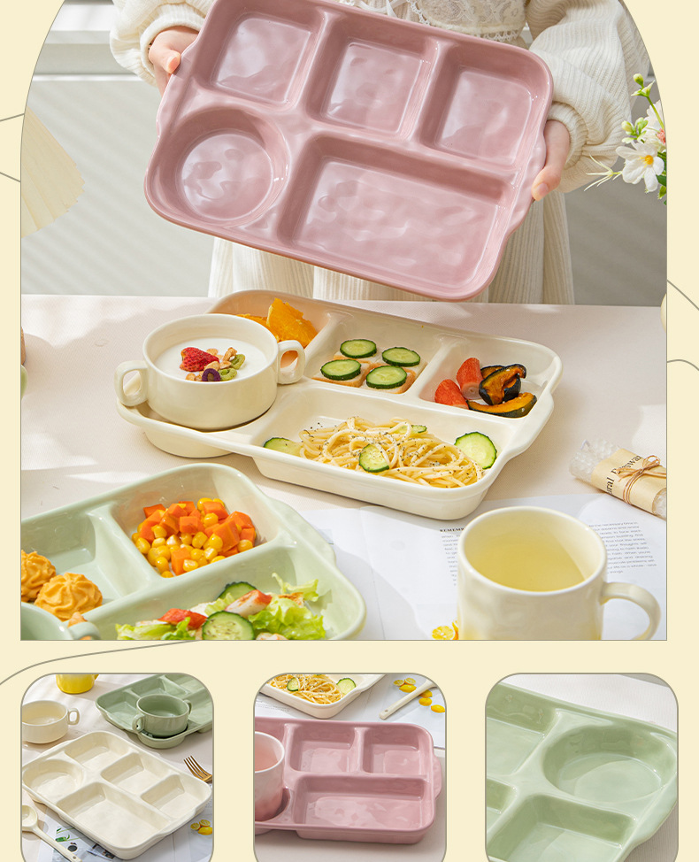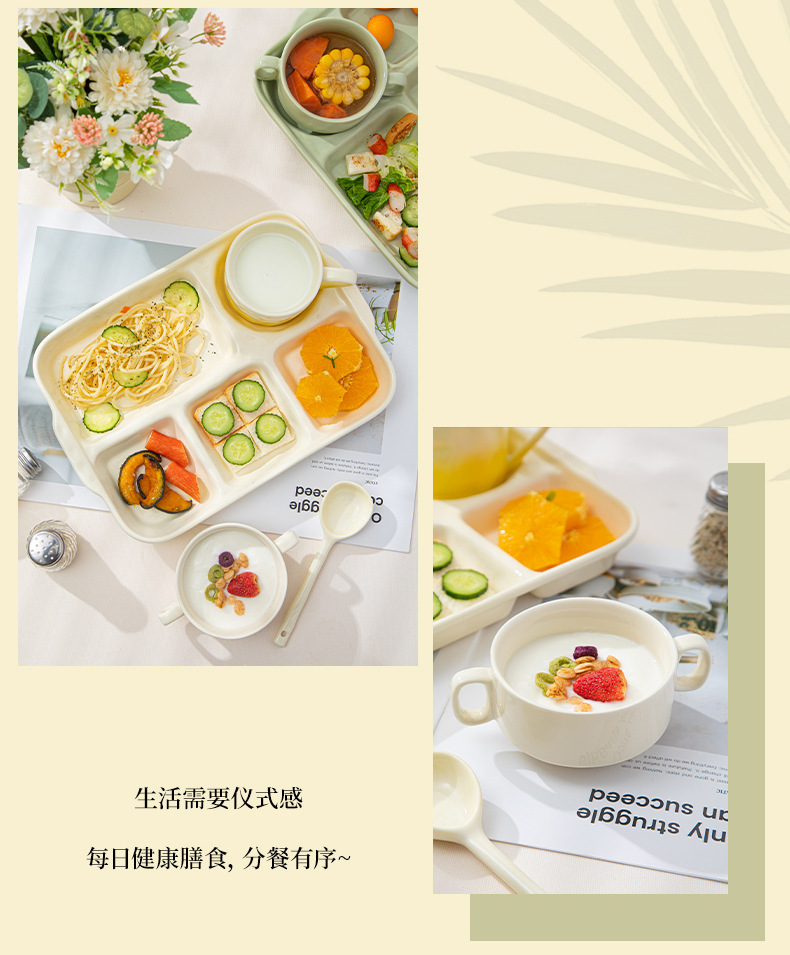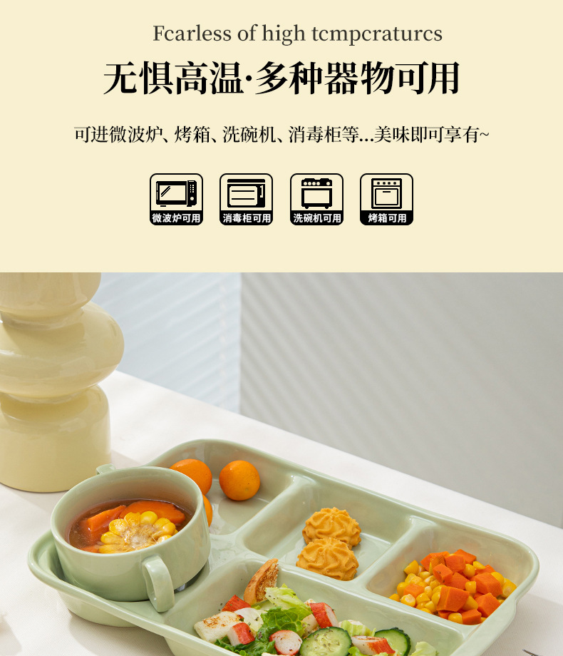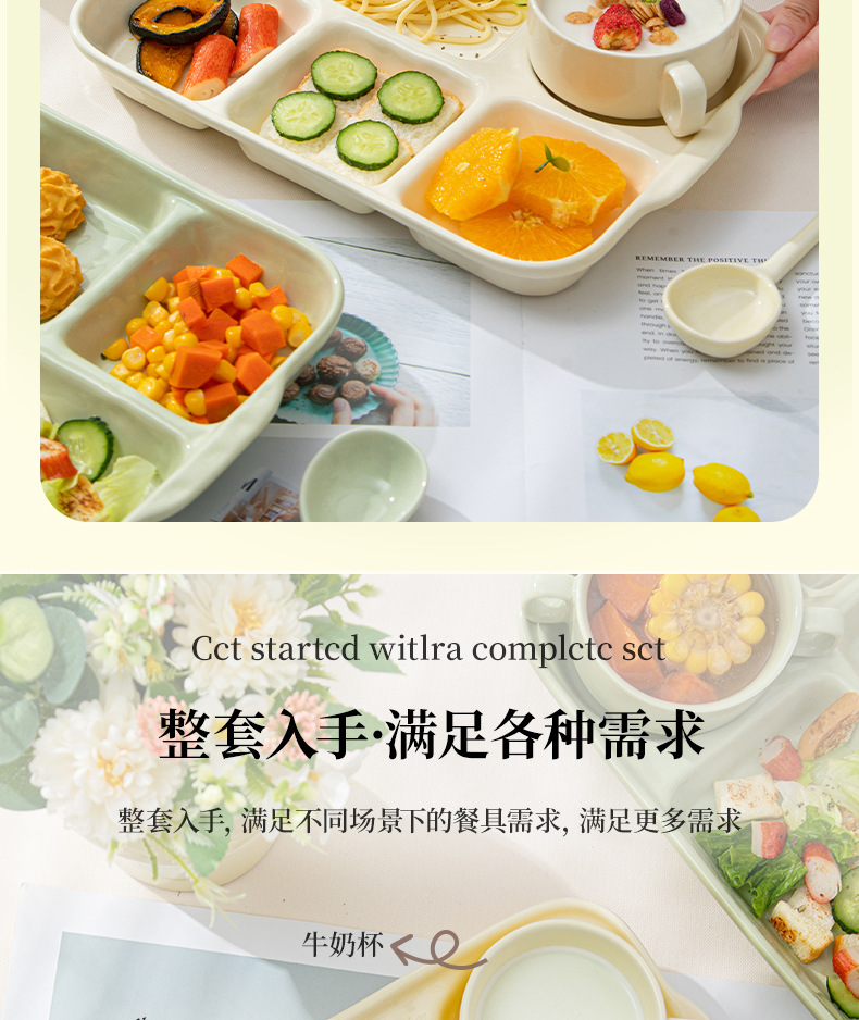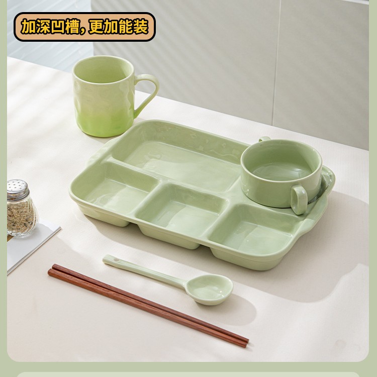 • 밀크 그린 - 5칸 서빙 접시 + 이중 귀 그릇 + 아침 식사 컵 [깊은 홈으로 업그레이드]