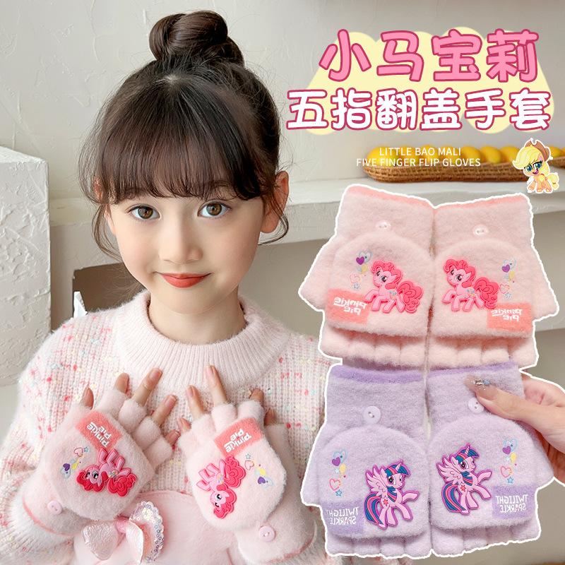 2024 새로운 어린이 장갑 겨울 기모 두꺼운 반 손가락 세트 겨울 따뜻한 유물 조랑말 폴리 도매