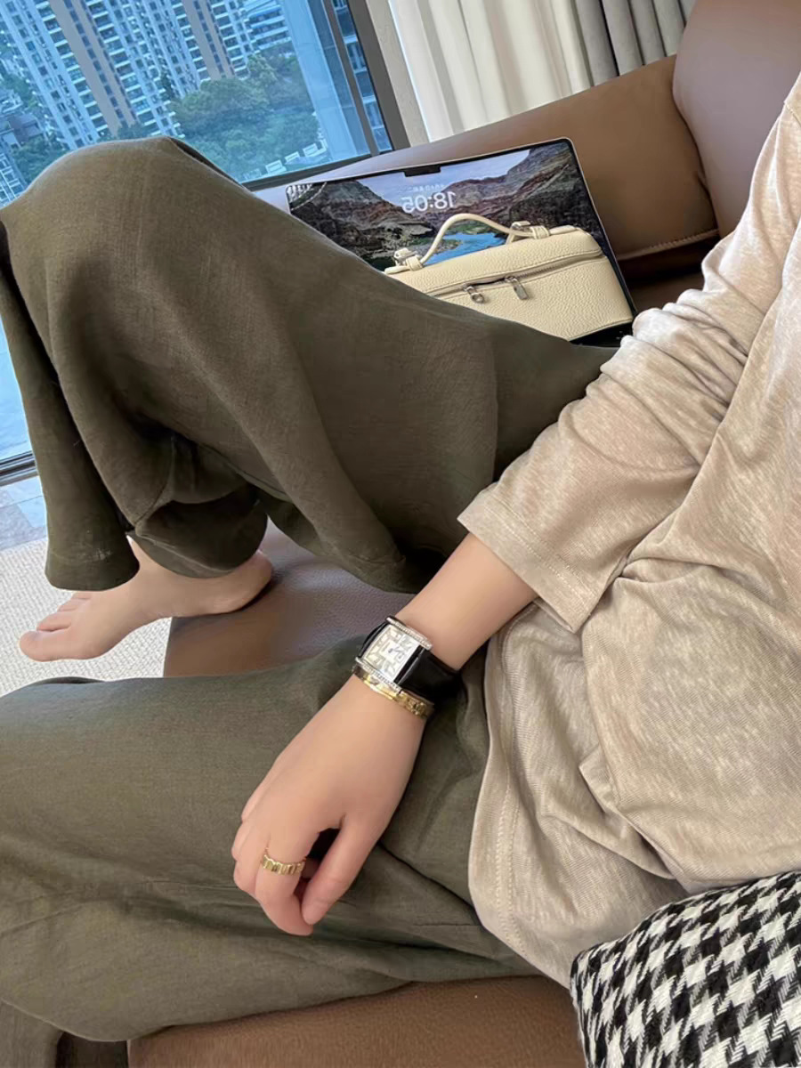 CHAO级推荐!军绿色天丝亚麻阔腿裤女松紧腰抽绳舒适百搭透气裤子